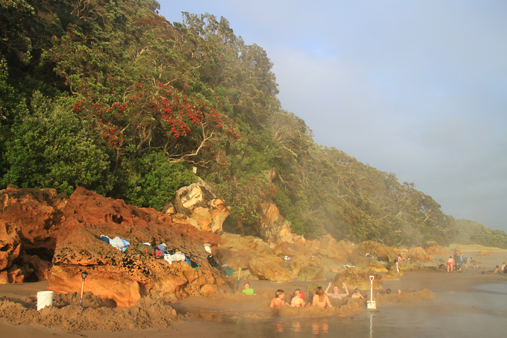 На полуострове Коромандел есть пляж, куда с соседних скал течет горячая вода из двух источников.
