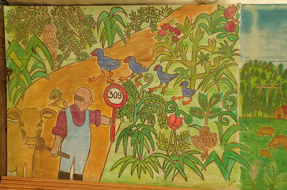 Рисунок недалеко от входа, про эпическую грунтовку 309. Для русского человека она очень неплохая дорога, но для киви — сплошной эпос. Приехавшим в парк даже дают наклейку типа «Я выжил на дороге 309!» :-)