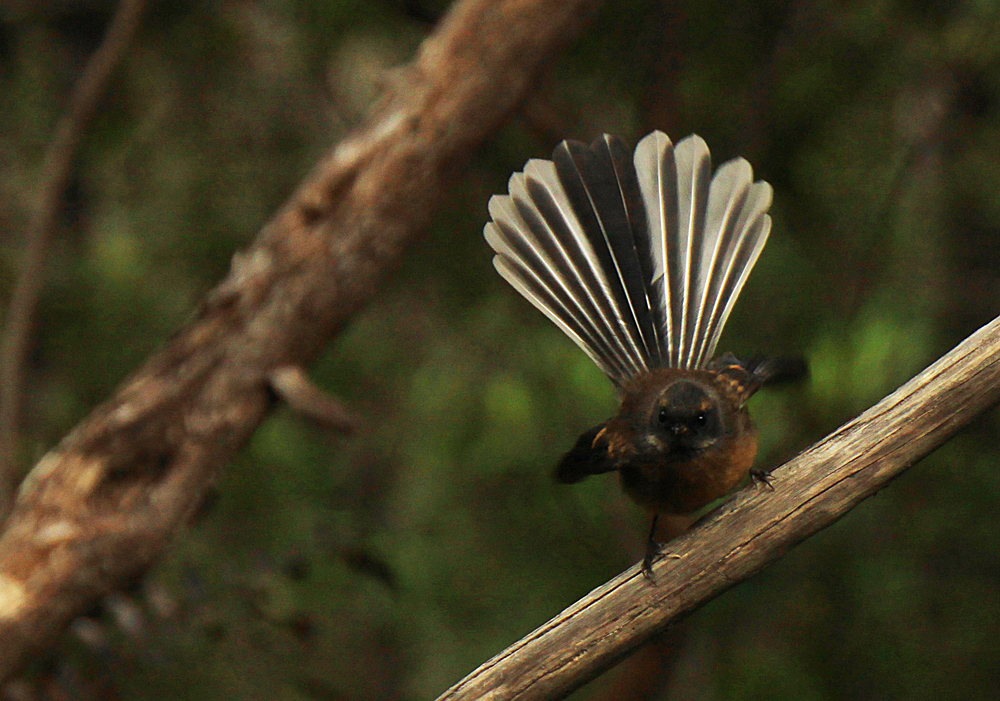 На обратном пути познакомились с птичкой веерохвосткой или fantail. Она смешно позировала, раскрывая свой хвост, действительно похожий на веер.