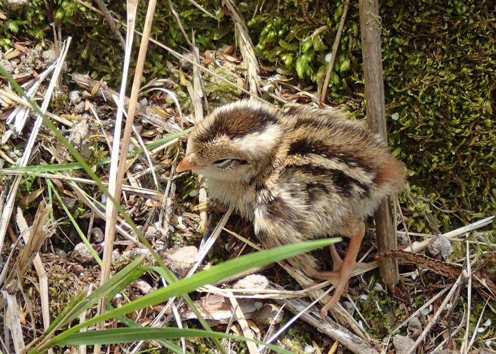 Неподалеку от озера мы встретили птенца. Он отбился от своих и пытался спрятаться в траве.