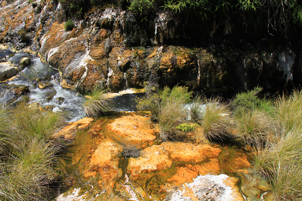 Из озера вытекает горячий ручей, в котором живут специальные яркие водоросли, а по берегам растут специальные термальные папоротники.