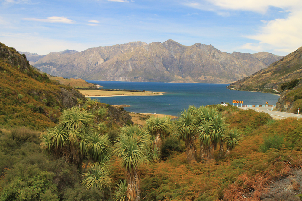 В этот раз перешеек нам был не по дороге. Мы специально приехали сюда из Ванаки, полюбовались озером и вернулись обратно, чтобы дальше ехать в нацпарк Аораки. Накрутили 300 километров, что для таких дорог не очень мало. Видите, как дорога извивается по берегу?