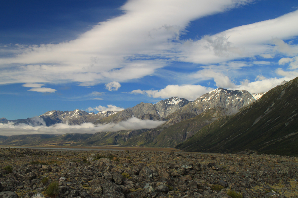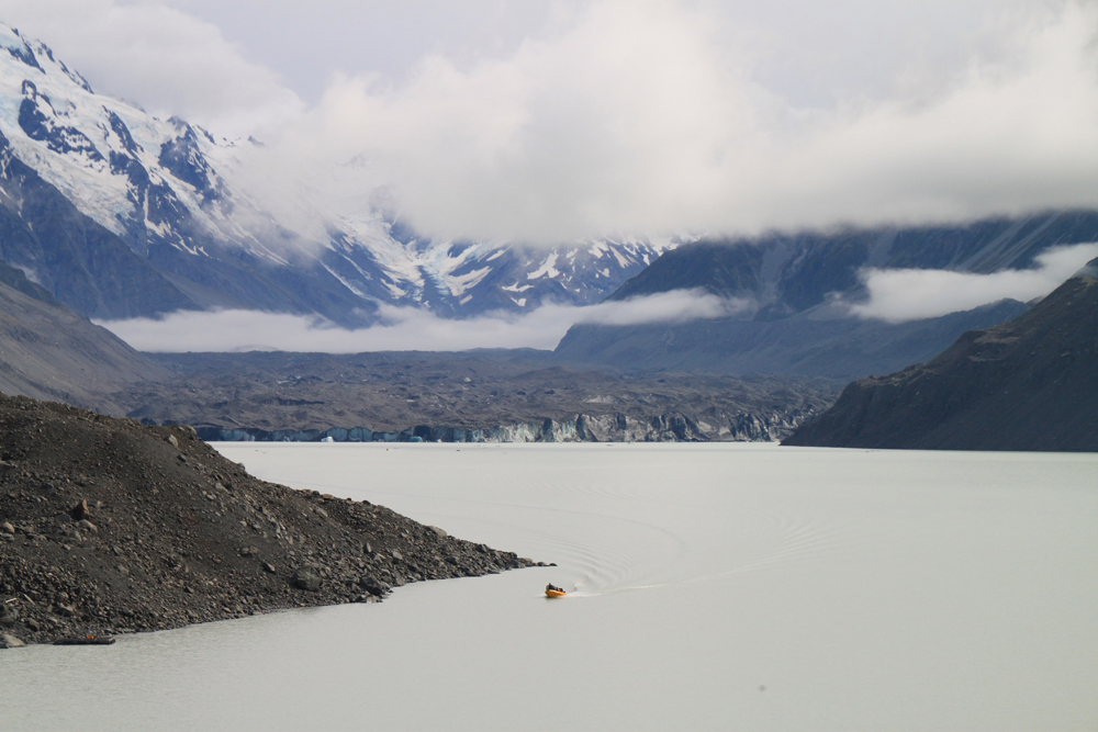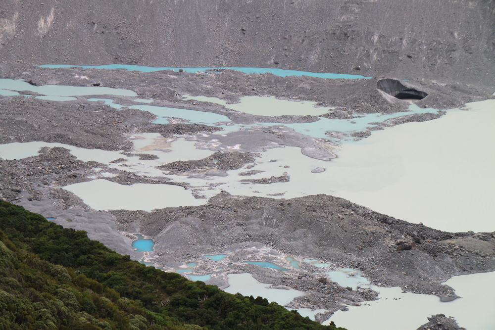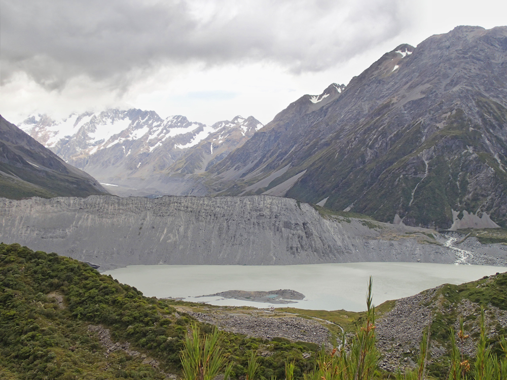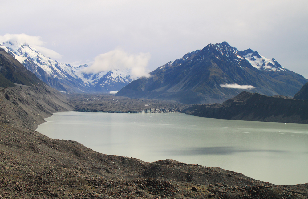В этой ледово-каменной мясорубке рождается чудесный цвет озера Пукаки. Вообще-то в озеро втекает в основном Тасманов ледник, он крупнее, но ледник Мюллера тоже участвует :-))