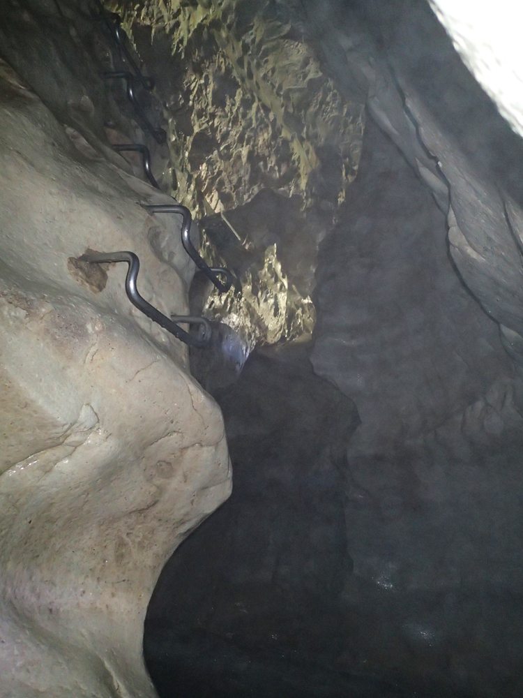 Надо подняться на 4–5 метров по скале через водопад, в сложном месте в ней сделаны скобы.