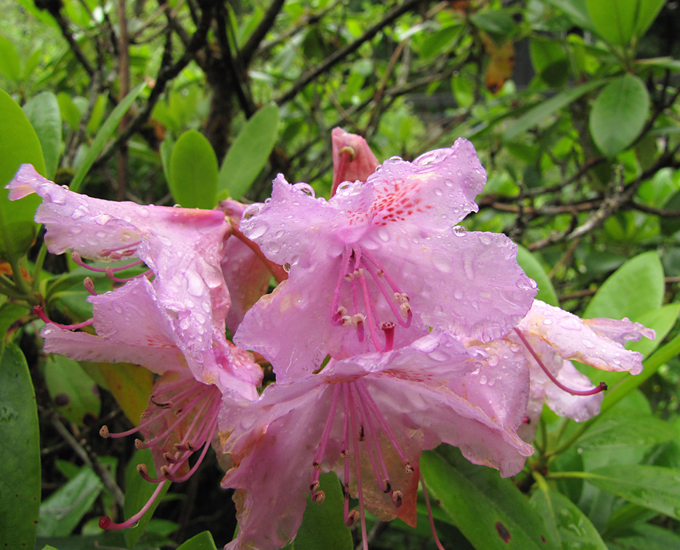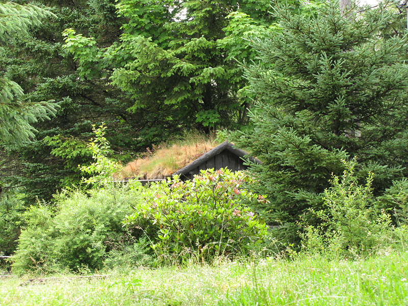 На переднем плане были рододендроны. В Норвегии это уже деревья, ну хорошо, большие двухметровые кусты. Они почти отцвели к тому времени, но я всё-таки нашла веточку с цветами.
