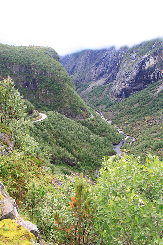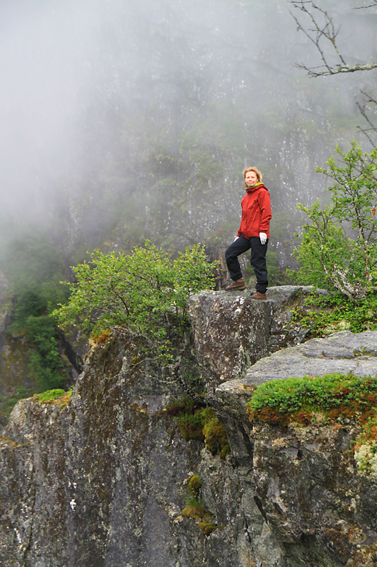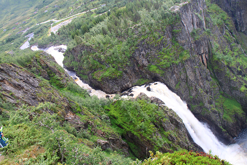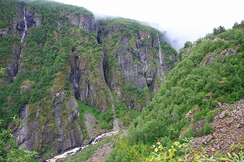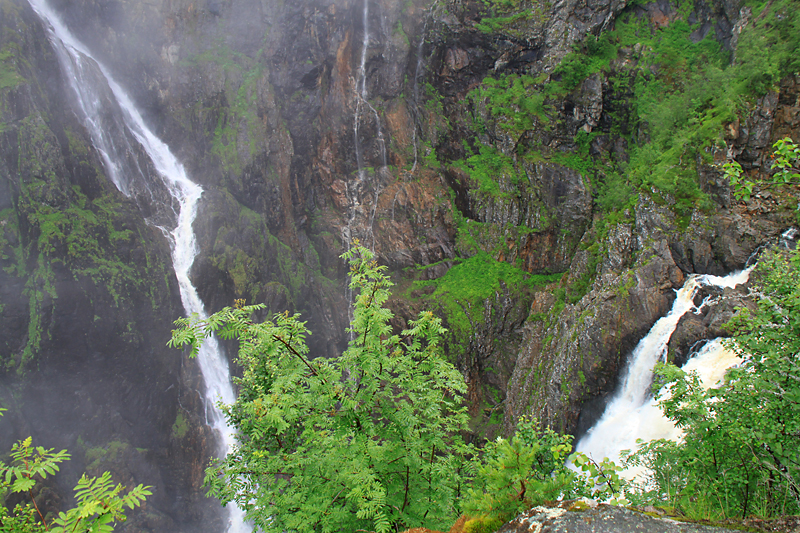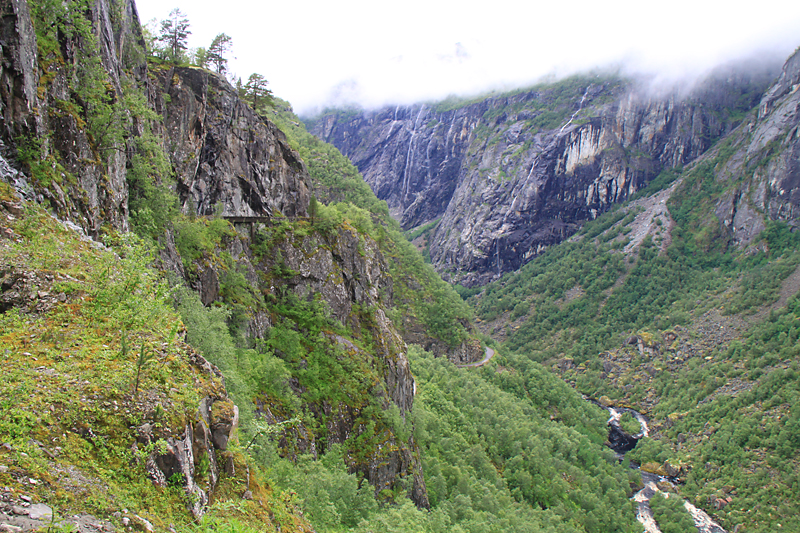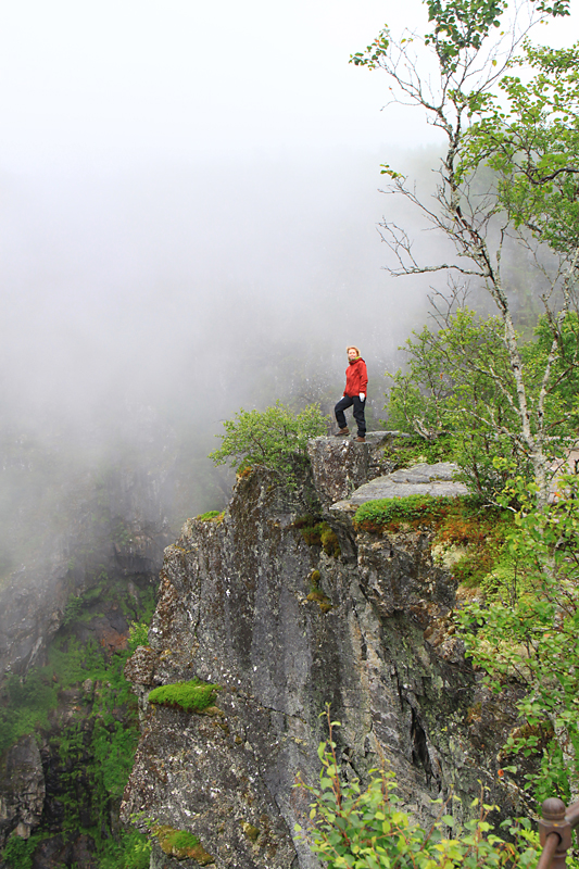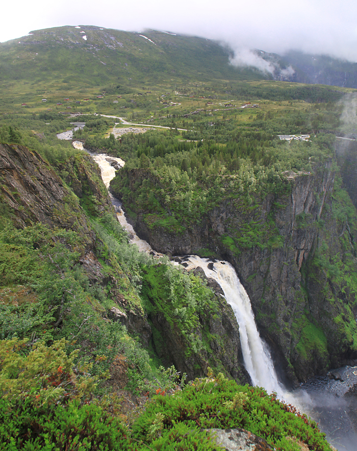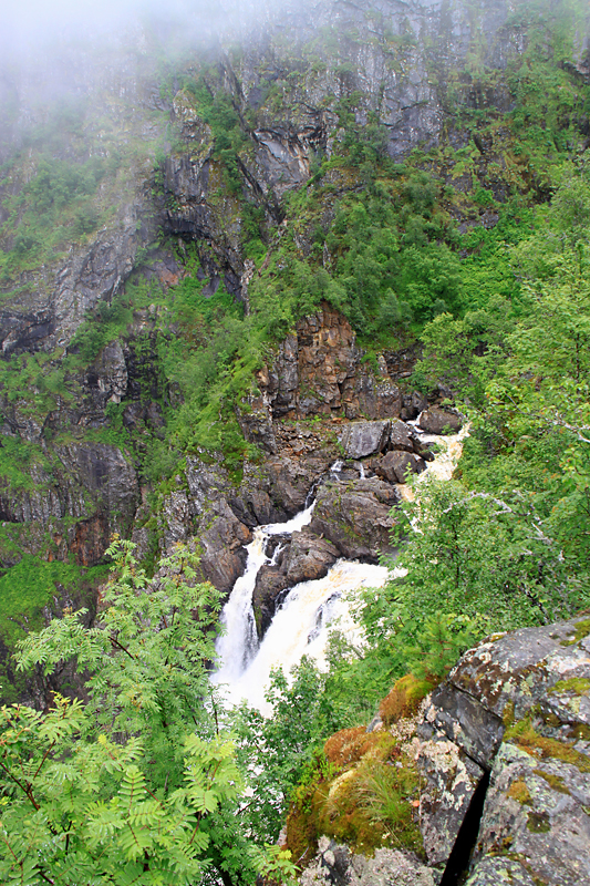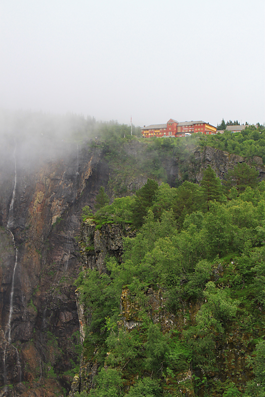 А потом мы приехали к водопаду Вёрингсфоссен. Все туристы покорно подошли к ограждению, послушали, как шумит 300-метровый водопад, и грустно побрели в автобус. Туман был такой, что за 20 метров ничего было не видно, только слышно.