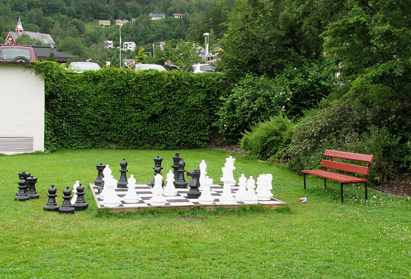 В Ульвике возле пристани я увидела огромные шахматы. Говорят, такие часто делают, но мне попались первый раз. Нужные силы, чтобы "ходить" ими, ведь шахматы каменные.
