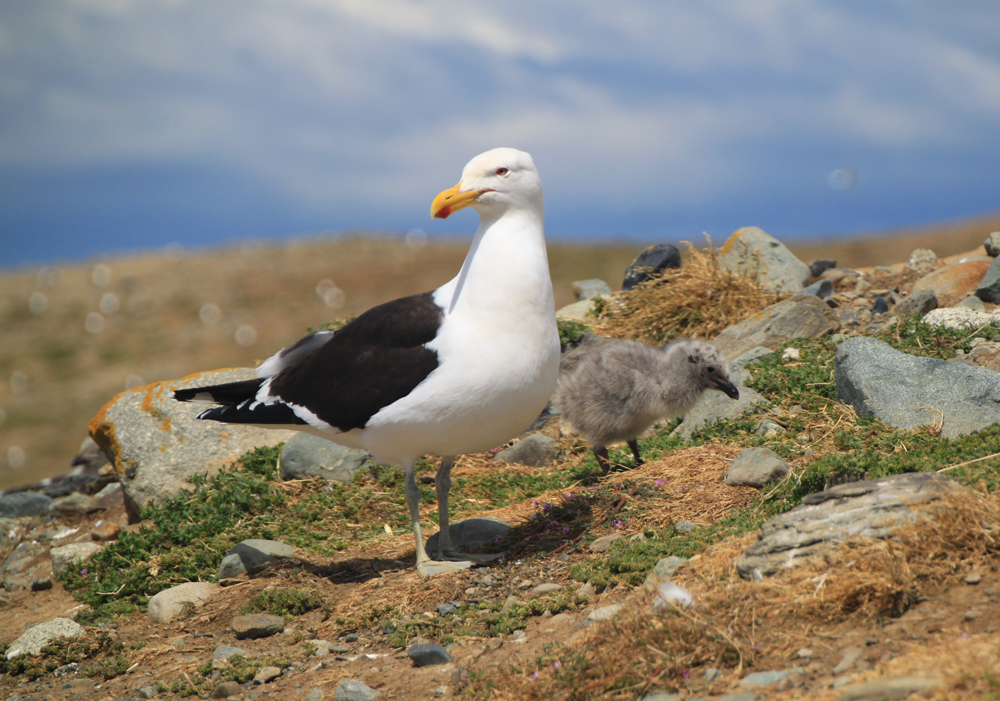 На острове живут не только пингвины, но и чайки, у них тоже летом вылупляются смешные серые птенцы в крапинку.