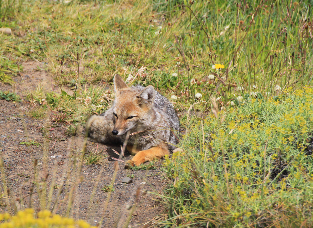 Неподалеку от мирадора лежала и отдыхала чилийская лиса. На туристов ей было наплевать.