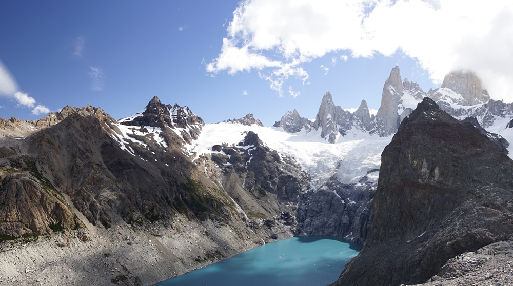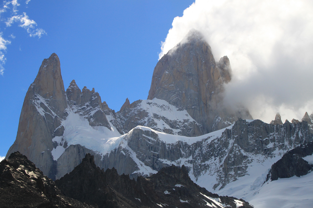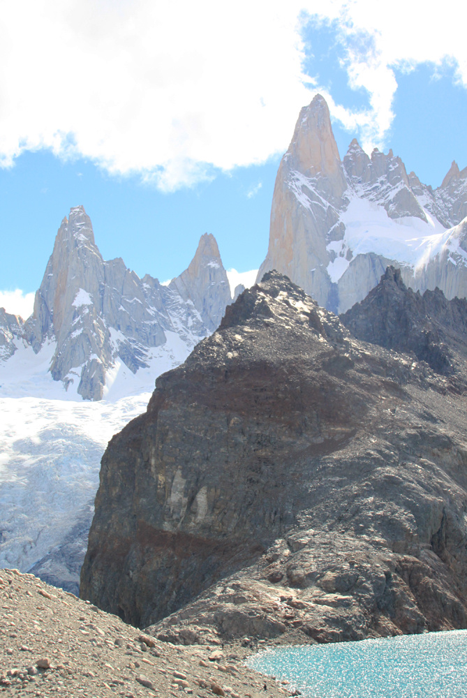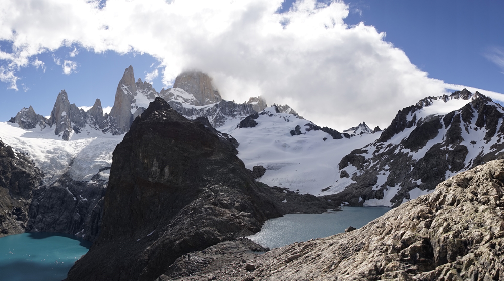 Все остальные пошли наверх к верхним озерам. Вместо заявленных двух километров от кемпинга там по gps почти три с половиной, последний участок весьма крутой — 500 м подъема. Так что эта часть примерно равна по сложности всему длинному, но простому подходу. Зато мы шли налегке. Фиц Рой то закрывался облаками, то открывался. Наверху мы подождали немного и все-таки поймали момент, когда облака разошлись.