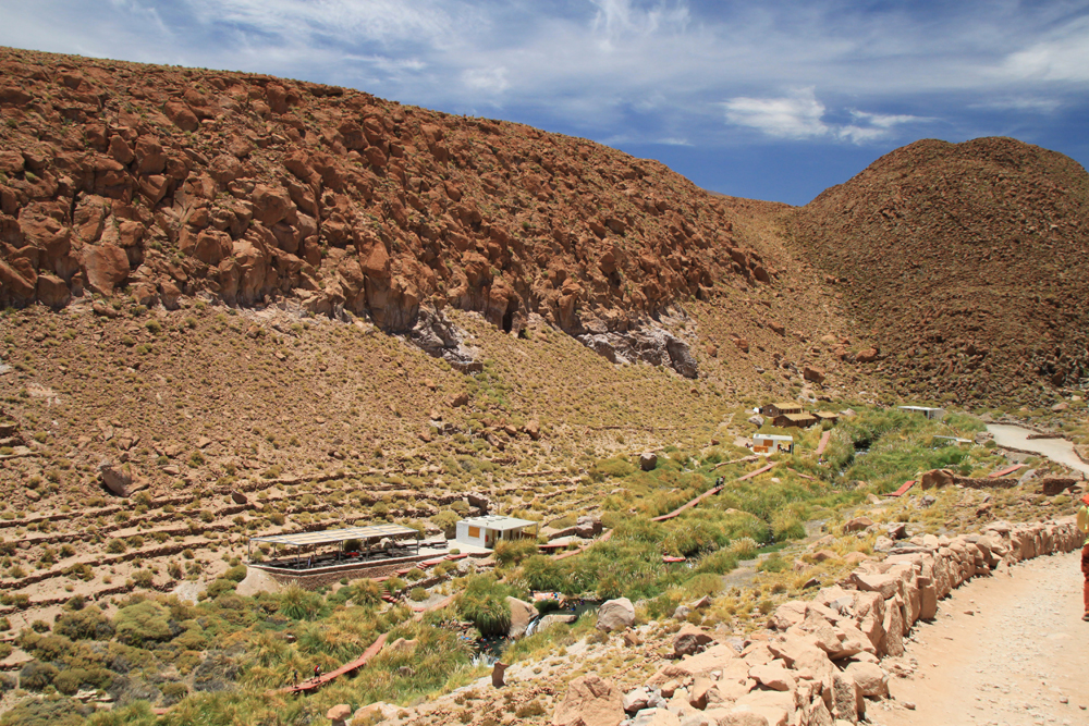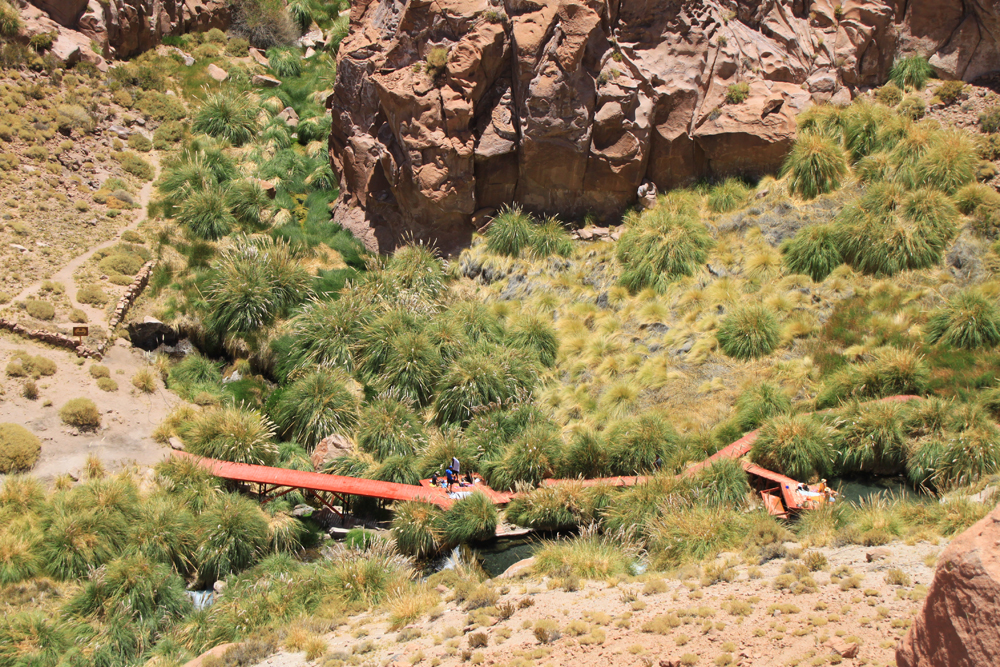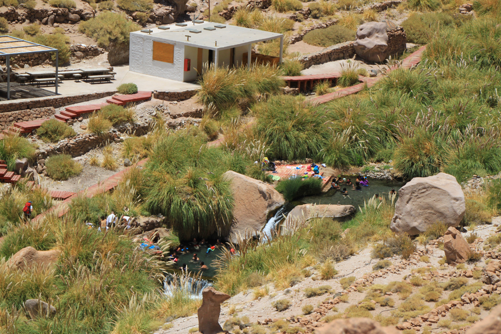После лагуны мы поехали в термы Puritama, что находятся в другой стороне от города, в 30 километрах на высоте 3580 м. Термы открыты с 9:15 до 17:30, плата за вход 15000 песо, но после 14:00 она снижается до 9000. Мы подождали в машине полчасика, так сэкономили, а заодно и пообедали :-)