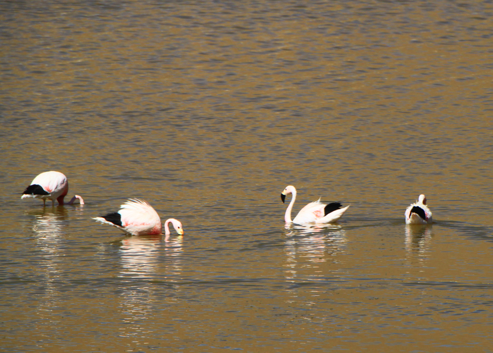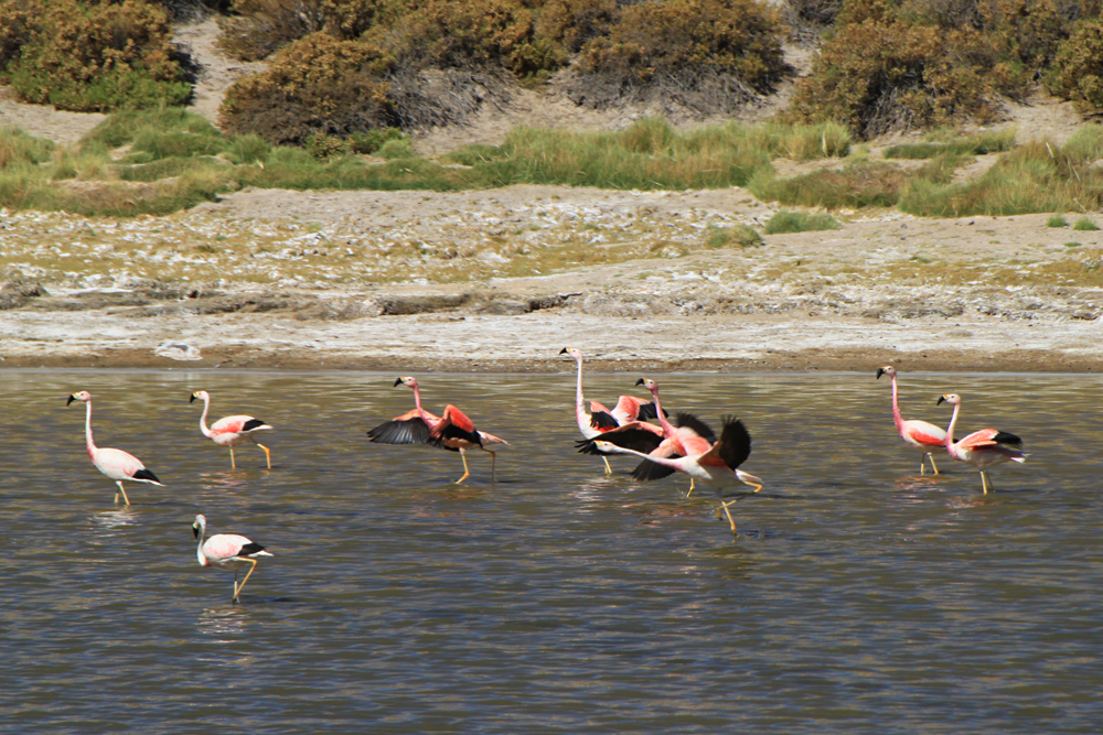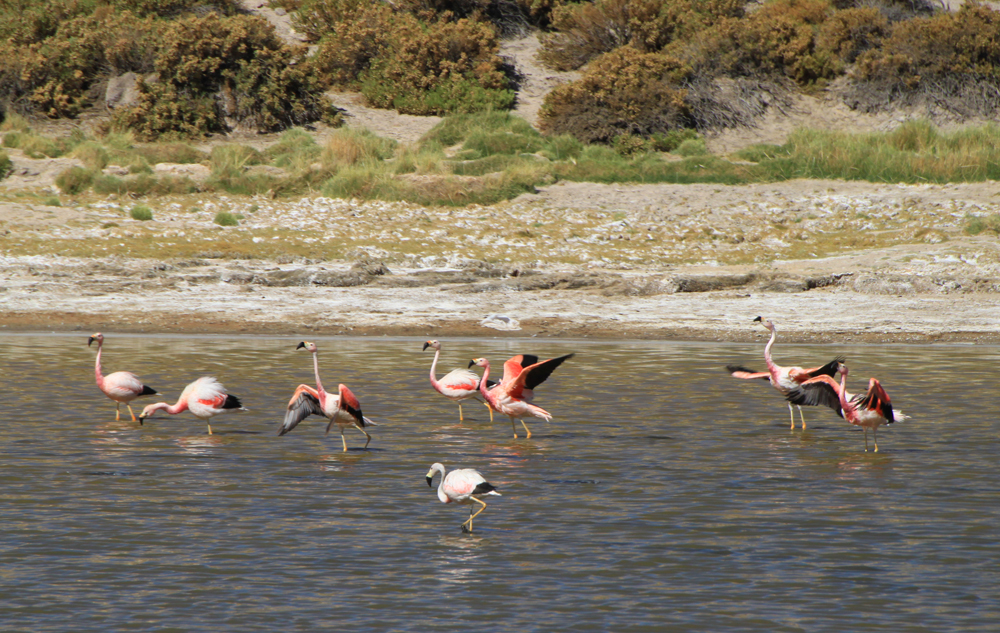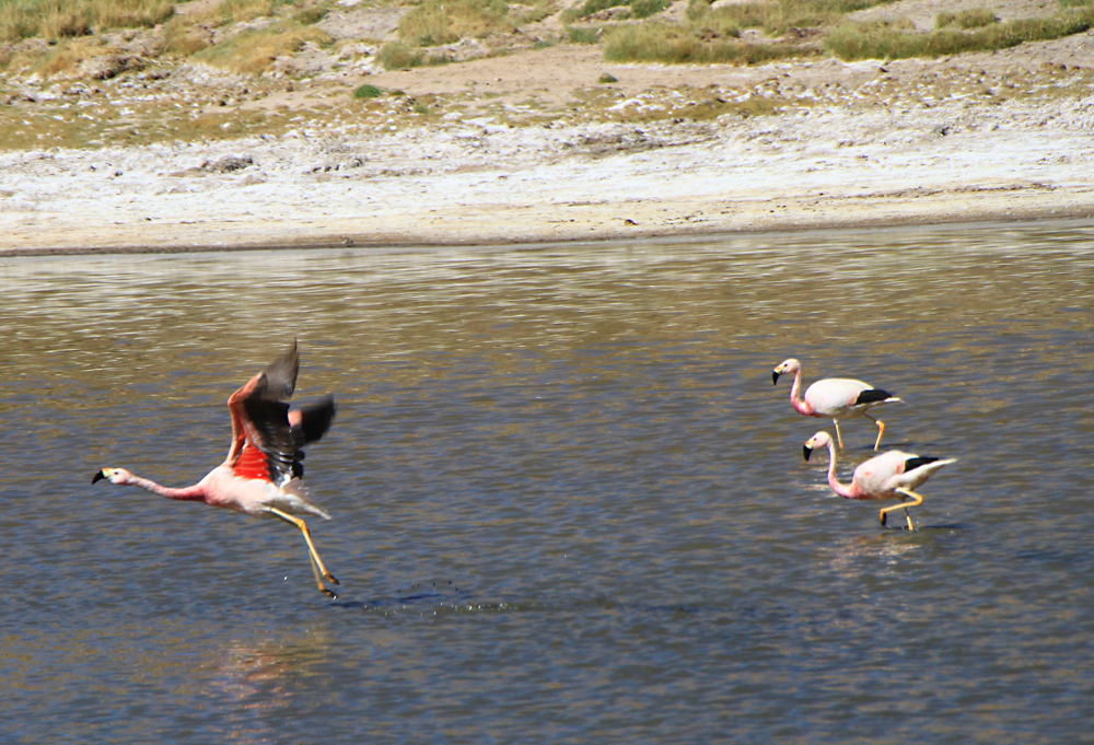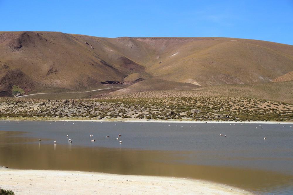 Всех туристов везут к гейзерам затемно, рано утром, чтобы встречать возле них рассвет. Мы же ехали днем и у нас была возможность полюбоваться лагунами. В лагунах кормятся фламинго.
