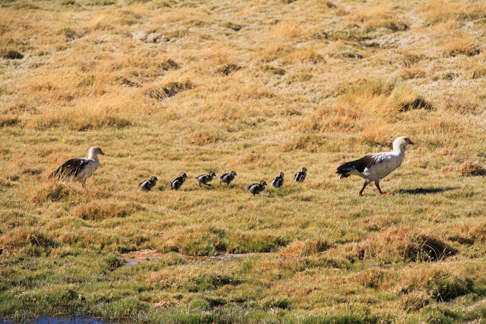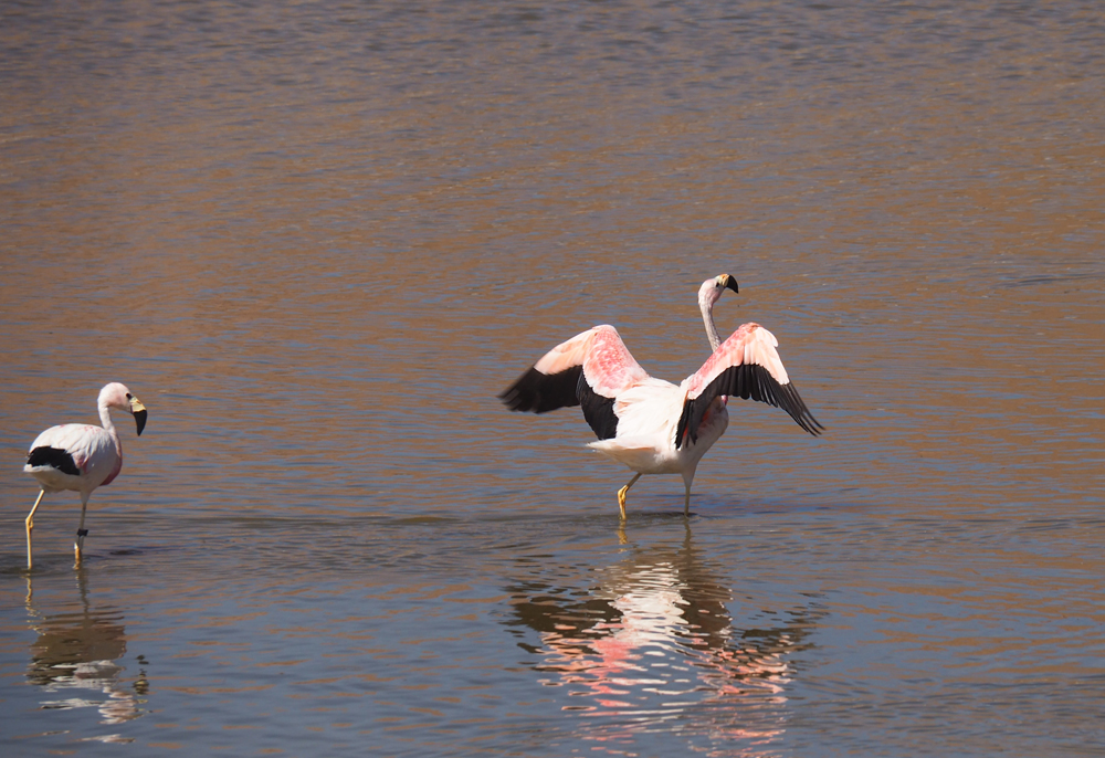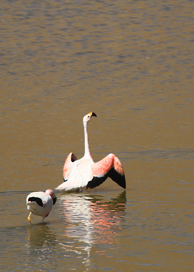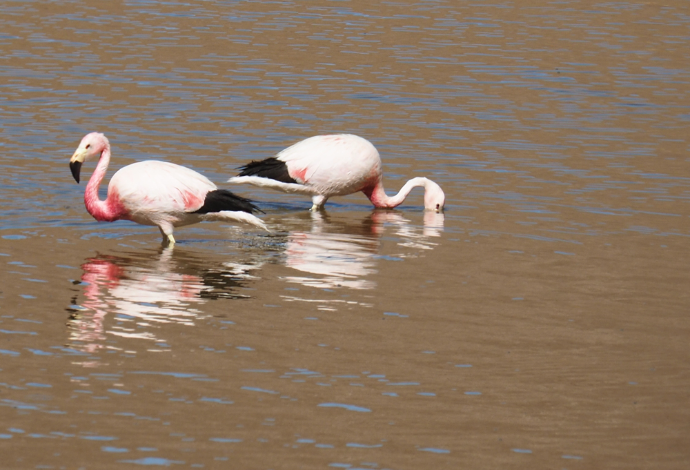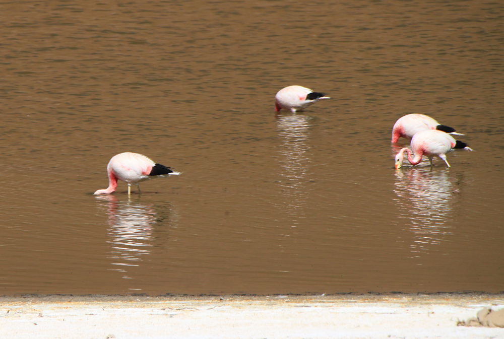 Всех туристов везут к гейзерам затемно, рано утром, чтобы встречать возле них рассвет. Мы же ехали днем и у нас была возможность полюбоваться лагунами. В лагунах кормятся фламинго.