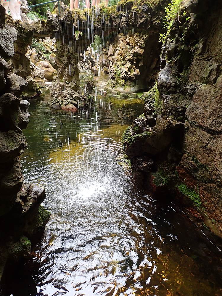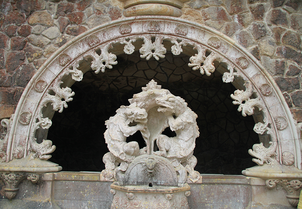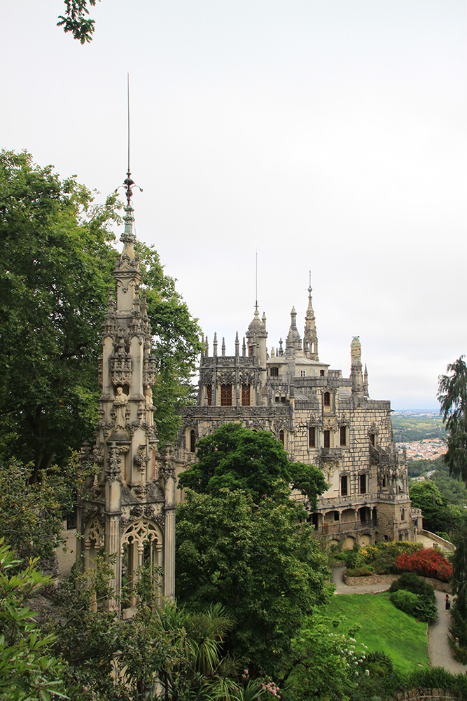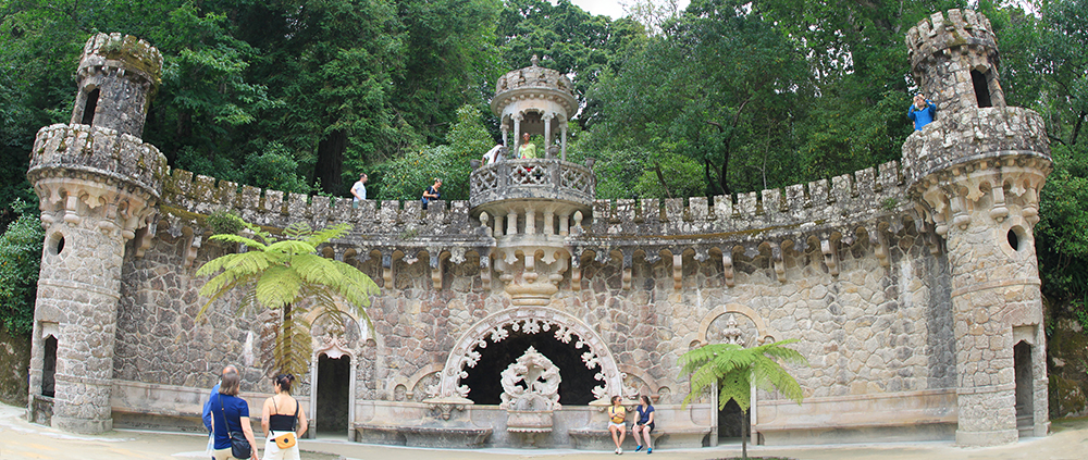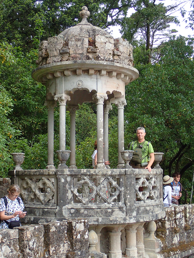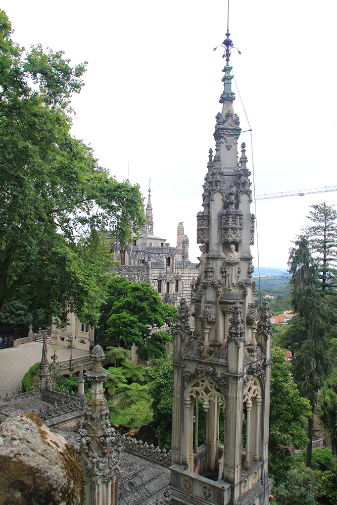 Мы сперва надеялись на прояснение, поэтому во дворец Пена сразу не пошли, а отправились в Кинта да Регалейра. Вход стоит 12 евро с человека, скидка по Лиссабонской карте 20 процентов. Облачность не мешает осматривать здешний дворец и парк, даже добавляет колорита.
