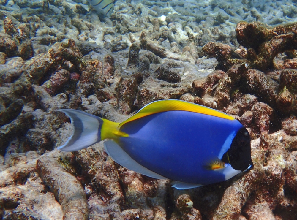 Это рыба-хирург, Powderblue Surgeonfish, мы таких раньше не видели. Но желтое лезвие возле хвоста намекает.
