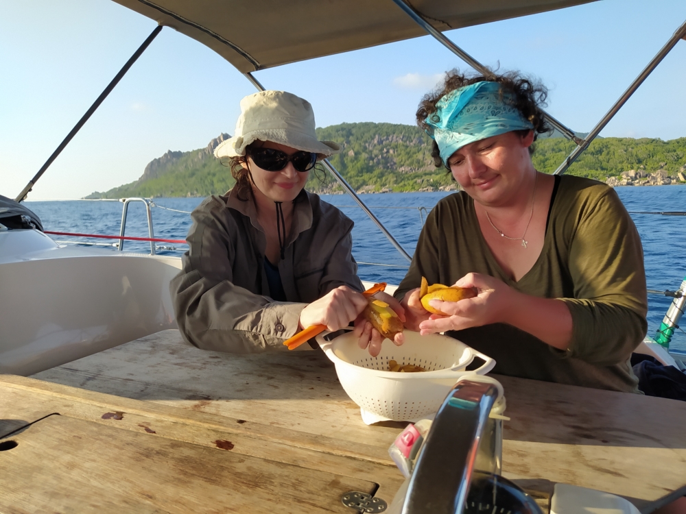 Яхтенные будни. Девушки чистят картошку на ужин.
