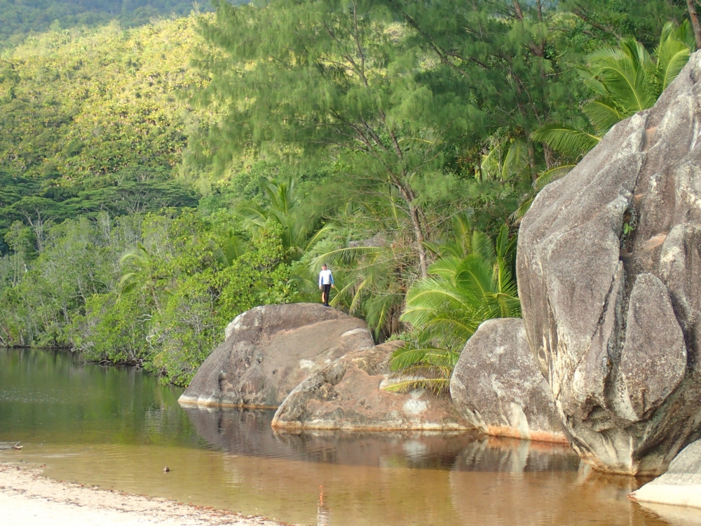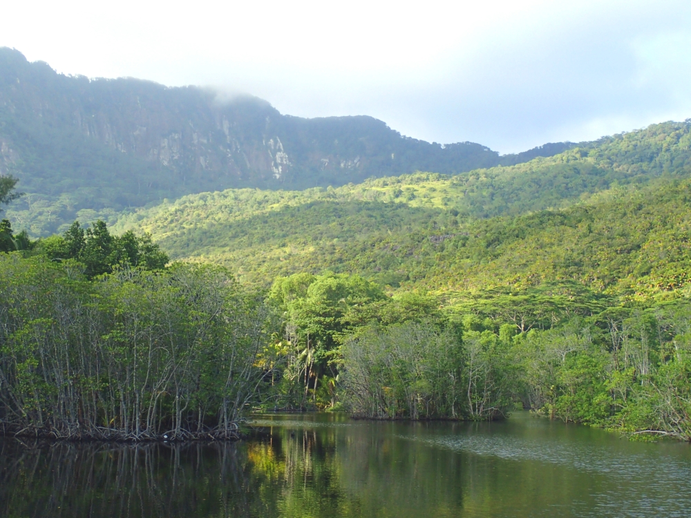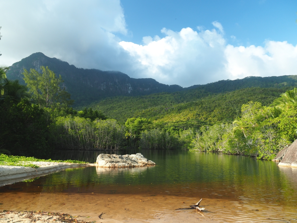 Сразу за пляжем начиналась пресная лагуна с красивым лесом вокруг.