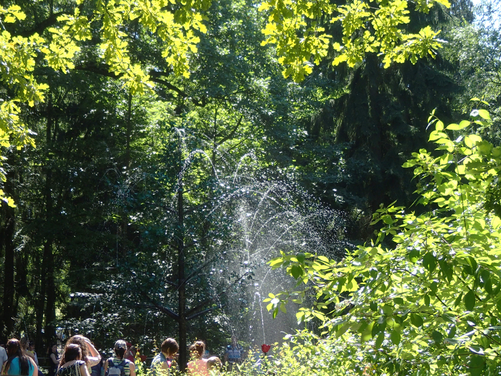 Было жарко, дети купались в шутейных фонтанах, а зеленые листья светились на солнце.