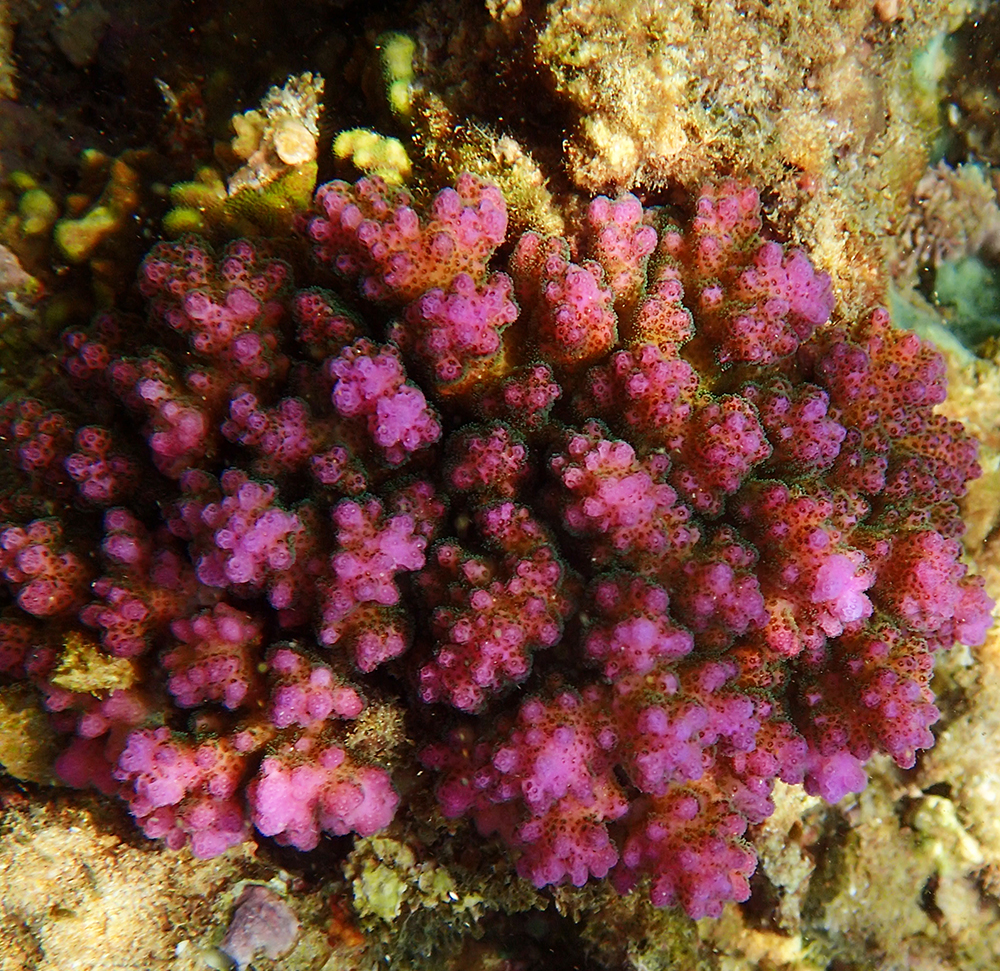 Кораллов считай что нет. Так, иногда попадаются отдельные свежевыросшие.