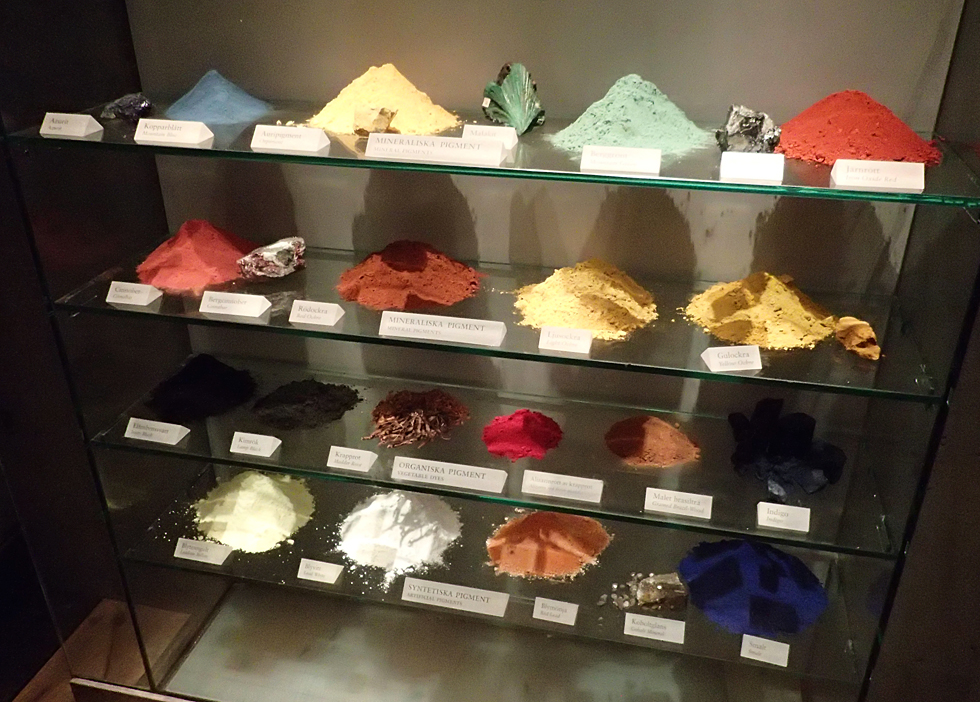 Раскрашивать заново корабль не стали, но изначально он был разноцветный. Вот витрина с красками — здесь и минеральные, и органические красители.