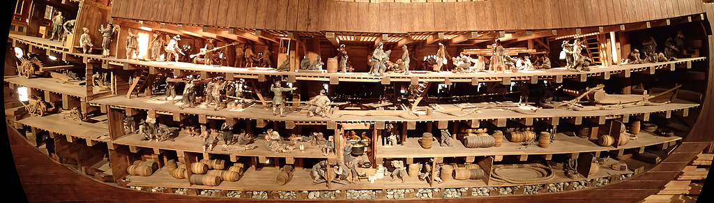 А мне корабль понравился, впечатляет и декором, и формой и размерами. Он стоит в темноте и холоде, видимо, иначе и так соленый, 200 лет пролежавший в морской воде дуб будет разрушаться. Поэтому приходилось снимать на высоком ISO.