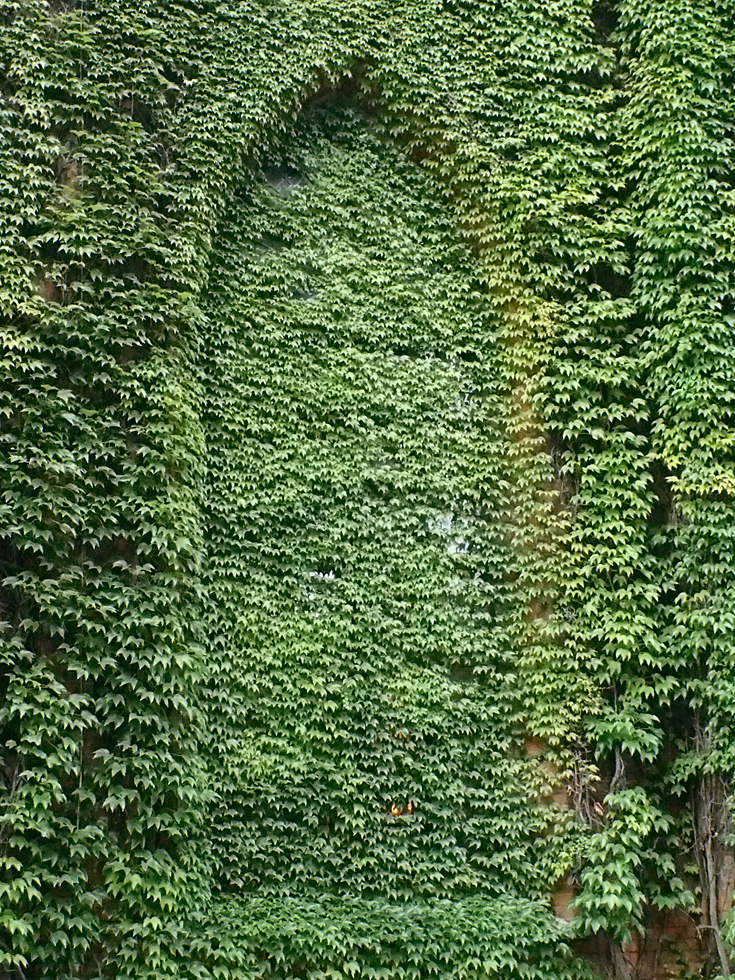 У этой церкви окно заросло плющом.