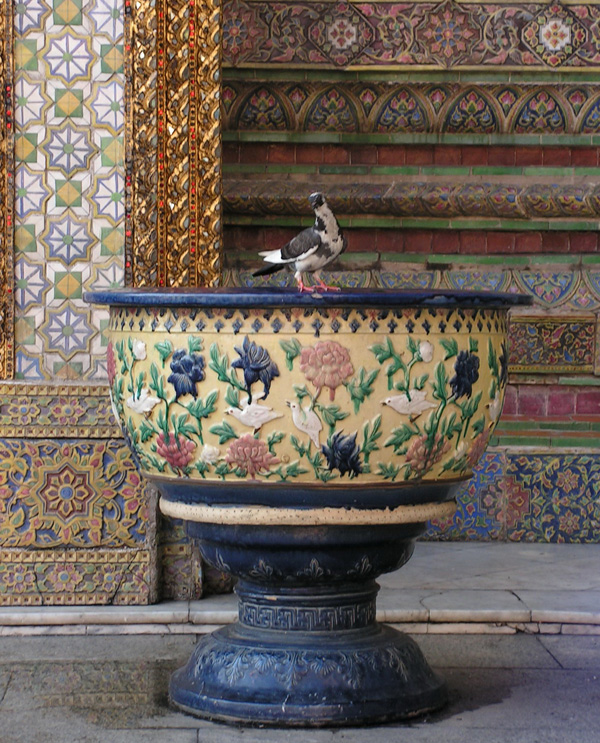 Голубь очень удачно сидит на вазе с птицами. В таких вазах делают клумбы. Тайская клумба - это ваза с водой, где растут лотосы.