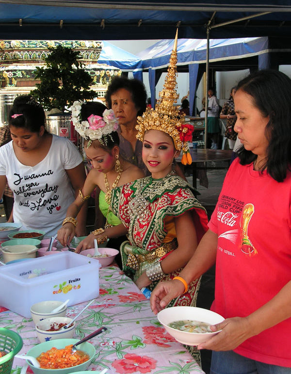 А еще при храме кормили. Там устроили день детской самодеятельности, возможно, банкет был по этому поводу. Я сперва застеснялась, но потом вспомнила о том, что тайский уровень жизни (а также ее продолжительность и всякий ВВП) гораздо выше российского, а значит, я тоже положу себе в тарелку всяких интересных вкусностей. И вообще, странников надо кормить.