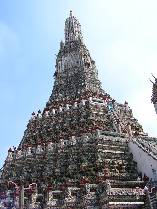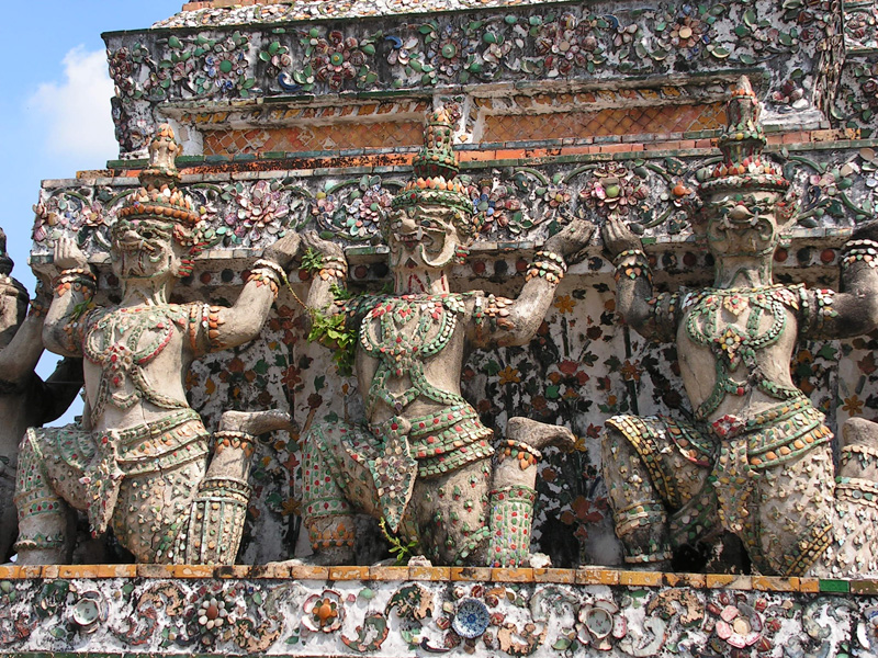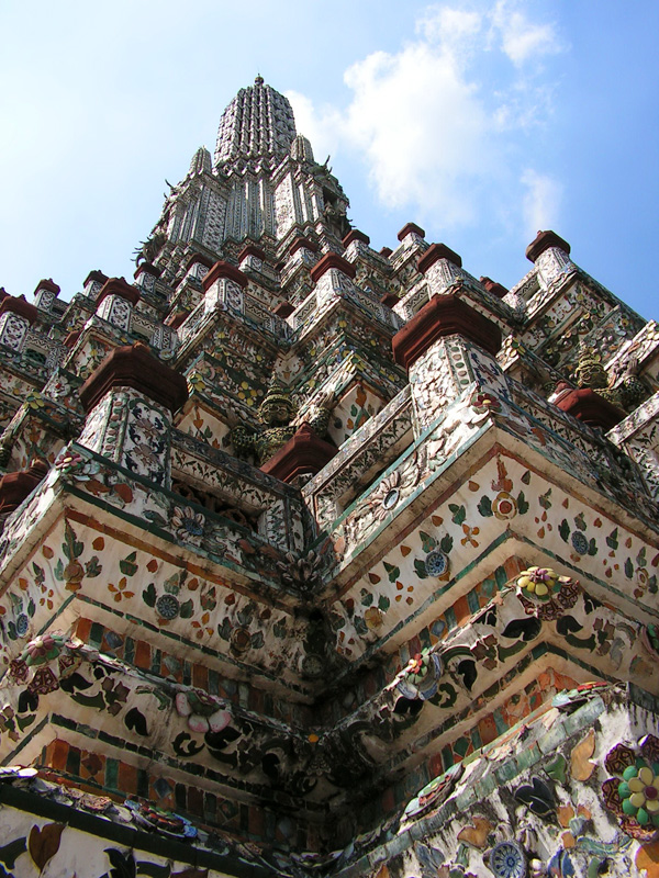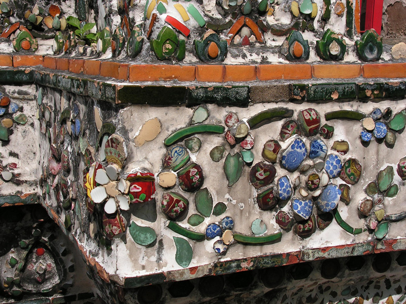 Отделан он не иначе как кусочками китайский сервизов. Это европейцы в ХХ веке придумали бить сервизы и украшать ими здания, тайцы еще в начале XVIII века так развлекались.