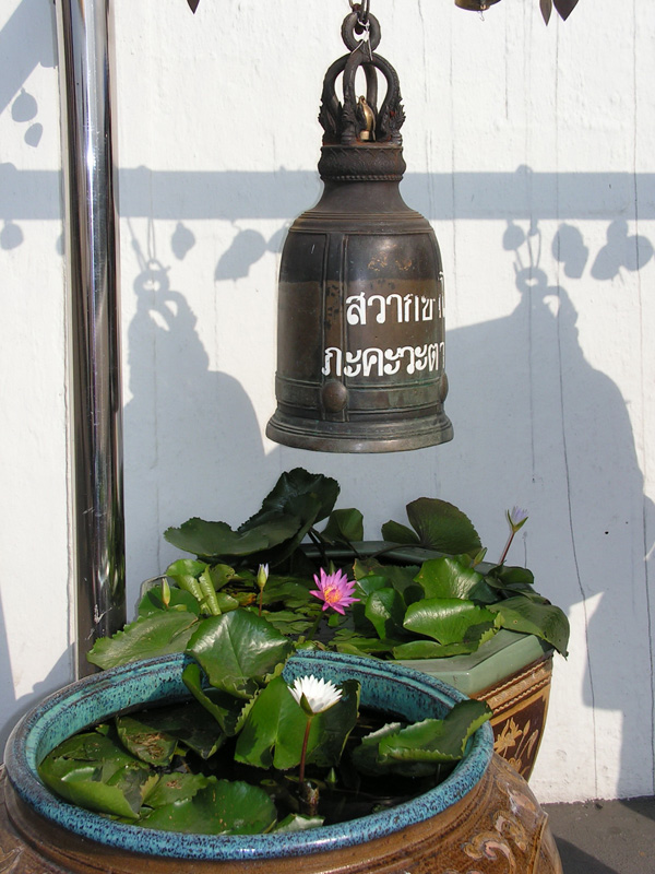 А вот и клумбы с лотосами. Вместо молитвенных барабанов у тайцев есть колокола, в которые можно звонить рядом с храмом: