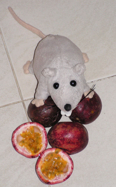 Мышь на сене на маракуйе. Она еще не знает о коварстве этого фрукта.