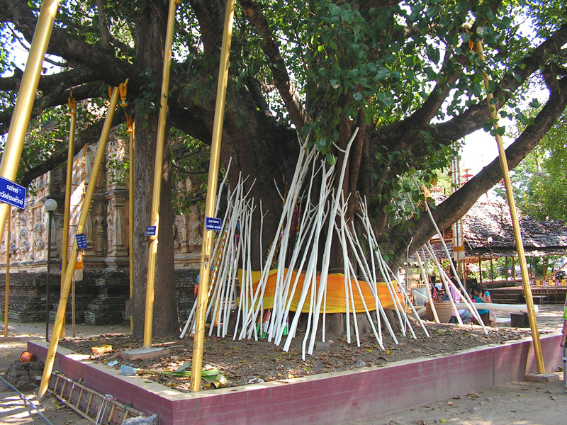 В каждом храме есть свое дерево бодхи внушительных размеров. Потому что во-первых, не одну сотню лет его выращивают; во-вторых, сажают несколько деревьев, которые потом срастаются. Ну а в-третьих, торжественно подпирают дерево со всех сторон, чтобы оно чувствовало поддержку окружающих.