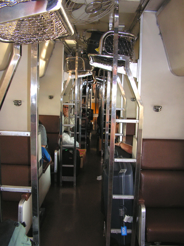 В отсеке 4 полки - по две с каждой стороны. В темное время суток приходит специальный дядечка-постельничий: он открывает специальным ключом верхние полки, раскладывает нижние полки и стелет всем постели. В поезде вкусно кормят за умеренные деньги, разнося подносы с едой по вагону. Единственный недостаток тайского поезда - зверский кондиционер. Поскольку чем ты холоднее едешь в тропиках, тем это престижнее и дороже стоит, кондиционер работает на полную мощность, особенно тяжело на верхней полке. На обратном пути я заклеивала его пластырем и была одета во всю имеющуюся теплую одежду. По дороге туда без этих ухищрений я заработала за ночь сильный насморк. Правда, в тропическом теплом и влажном климате обычный насморк проходит полностью за два дня, но эти два дня были неприятными.