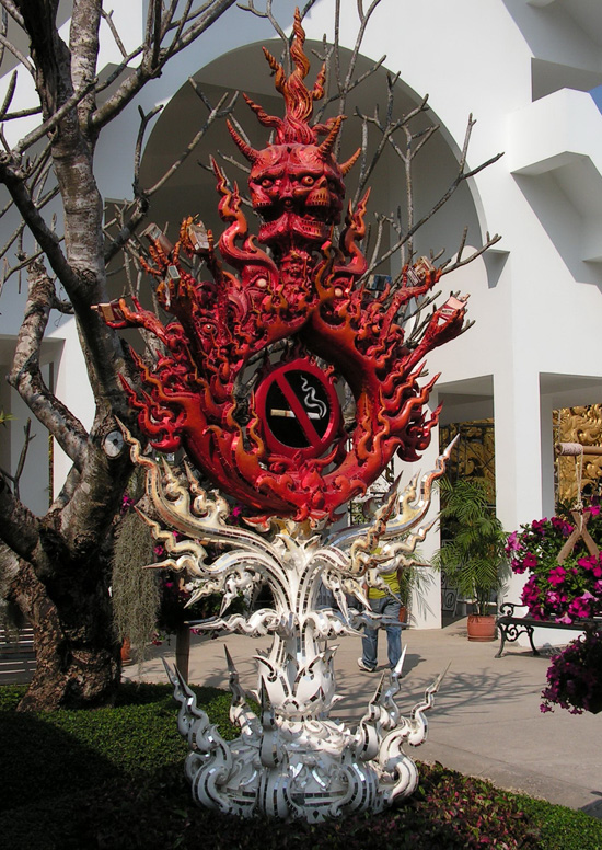 У храма есть автор - художник и архитектор с трудно произносимым именем Чалемчай Коситпипат. На вид - круглолицый жизнерадостный таец, настолько обычный и "здешний", что это в голове не укладывается. Я видела его только на фотографиях, но вообще он уже 13 лет строит этот храм и его часто можно увидеть за работой. У него очень своеобразные картины на религиозные темы, легко узнаваемый изысканный стиль с завитушками. Рядом с храмом есть галерея его работ. И роспись внутри храма, которую, к сожалению, нельзя фотографировать, тоже его творение.