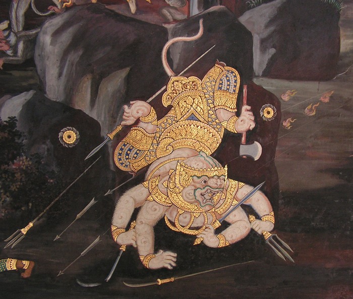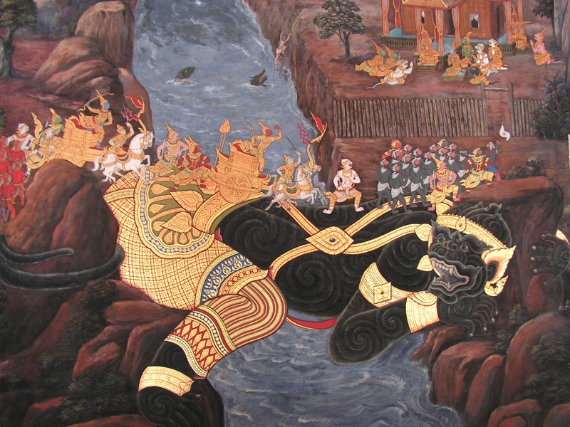 Когда посещаешь достопримечательности во второй раз, можно позволить себе внимание к мелким деталям. Вот фрагменты фресок на тему тайской версии Рамаяны: