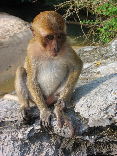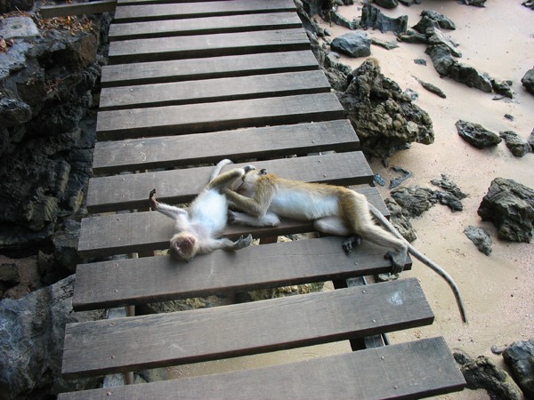 К этому пляжу от основной пляжной линии Ао Нанга сооружена тропинка через скалы в виде деревянного настила. И на ней живет стая обезьян: