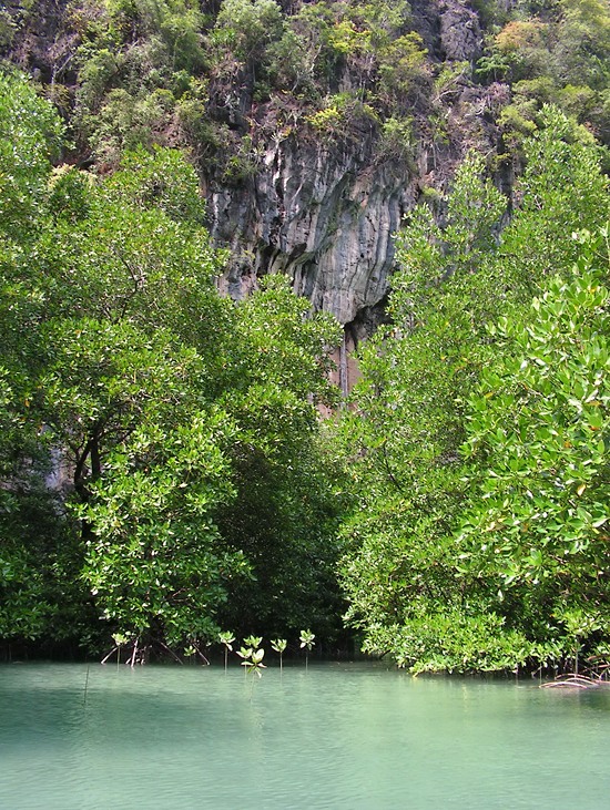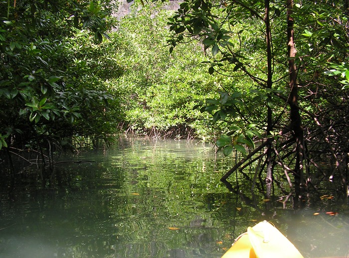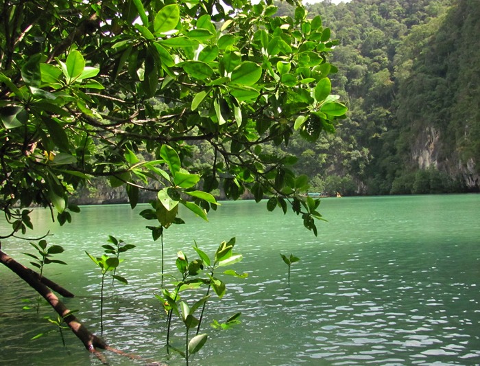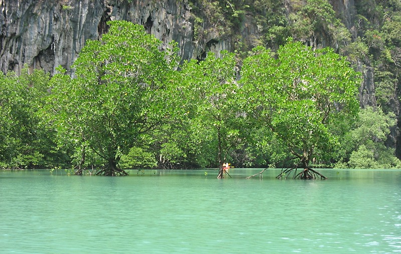 Внутри лагуны растет мангровый лес, по которому можно плавать: