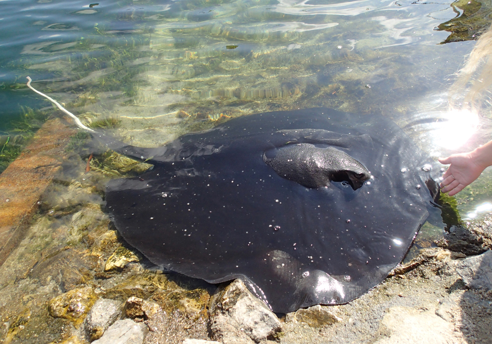 Это совершенно ручной скат, он приплывает к берегу, чтобы его погладили. Обратите внимание на размеры.