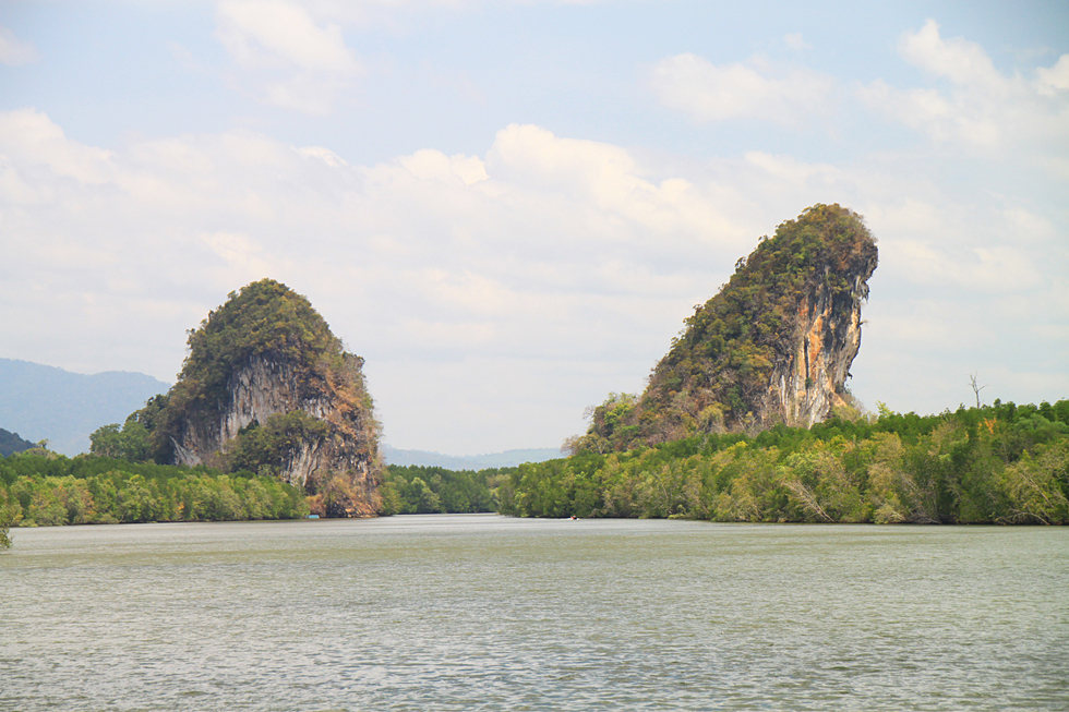 Крабы стоят на набережной, на берегу мангровой реки с вот такими живописными скалами.
