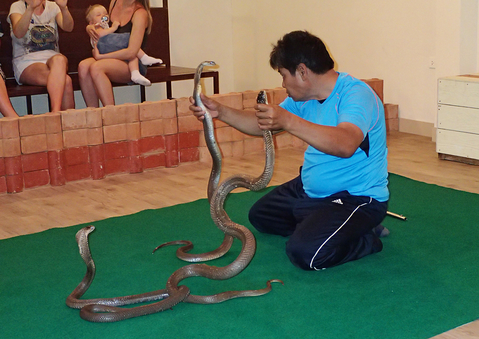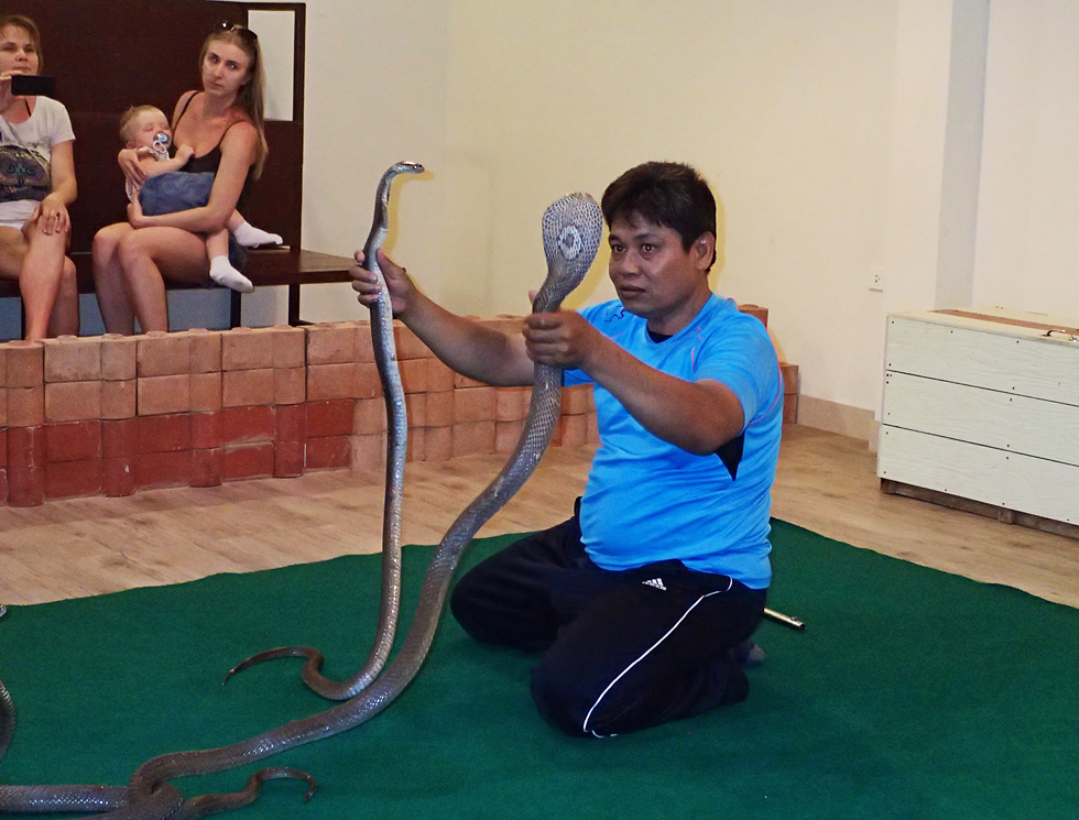 Самая ядовитая змея Таиланда — королевская кобра, с ними никаких шоу. Яда одной змеи достаточно, чтобы убить слона, а у человека есть всего 10 минут на прощание с родственниками. А это была обычная кобра. Ночью она будет совсем злая от бесцеремонного обращения, а днем кобры спят, поэтому их можно поцеловать в нос.