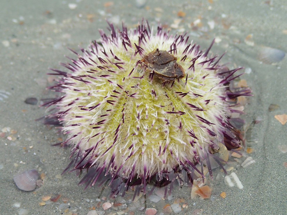 Когда дождь закончился, пошли на пляж Аонанга. Там был отлив и на отмели лежали морские ежи. Это вполне живой еще еж, не знаю, зачем он вылез из воды. Наступить на такого в море не хотелось бы.