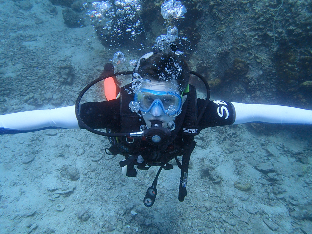 На следующий день мы неспешно занырнули на Japanese garden возле острова Нан-Юань. Это мелкий дайв-сайт для новичков, куда лодка Scuba birds ходит каждый четный день. Там мы сделали все необходимые упражнения, я восстановила нужные рефлексы и дальше проблем не было. На втором погружении там же тренировали плавучесть: это когда управляешь движением вверх-вниз, изменяя объем легких. И так надо плавать через специальные железные конструкции — парк плавучести называется.