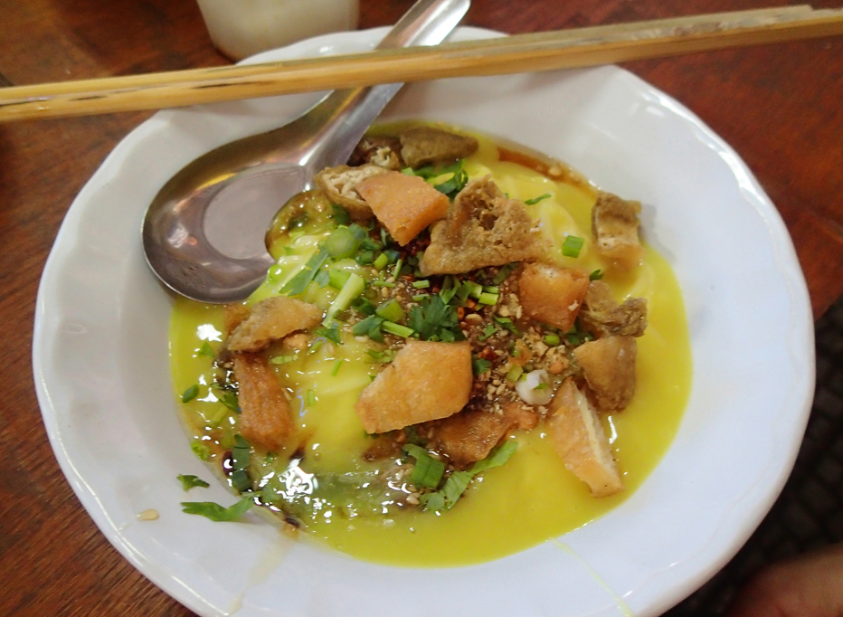 По утрам в Мэхонгсоне можно завтракать на утреннем рынке. А заодно купить там фруктов. Манго были за 80 бат килограмм, что для зимы недорого. Мы решили быть ближе к народу и ели вместе с тайцами. 20 бат — и вам выдают вот такой завтрак, название которого я так и не смогла запомнить.