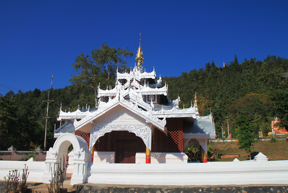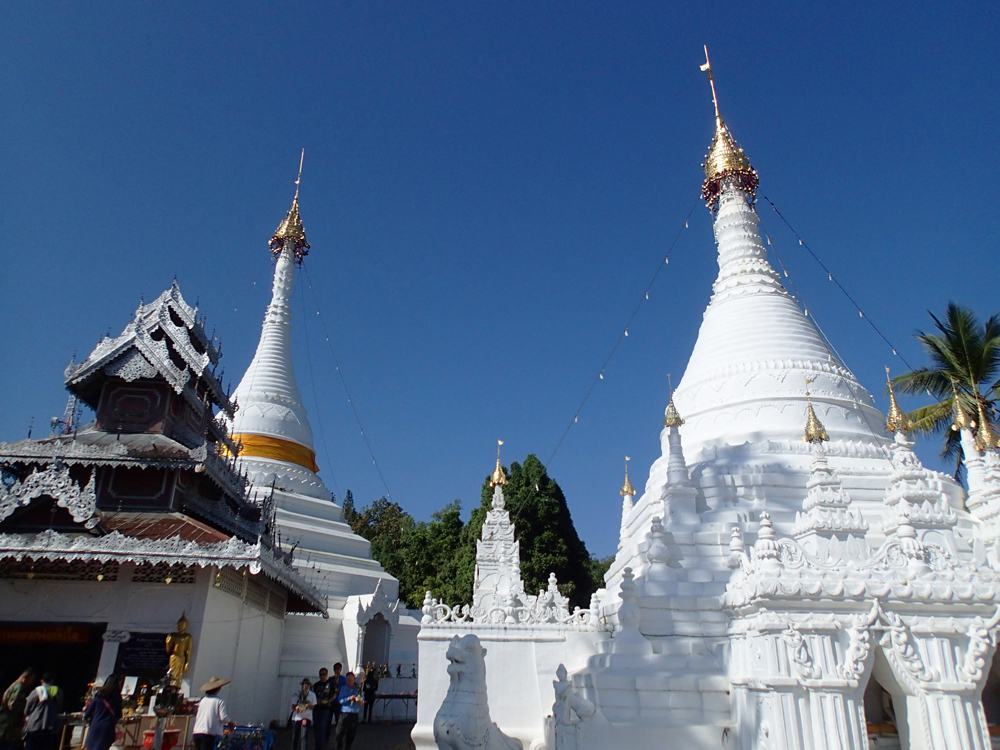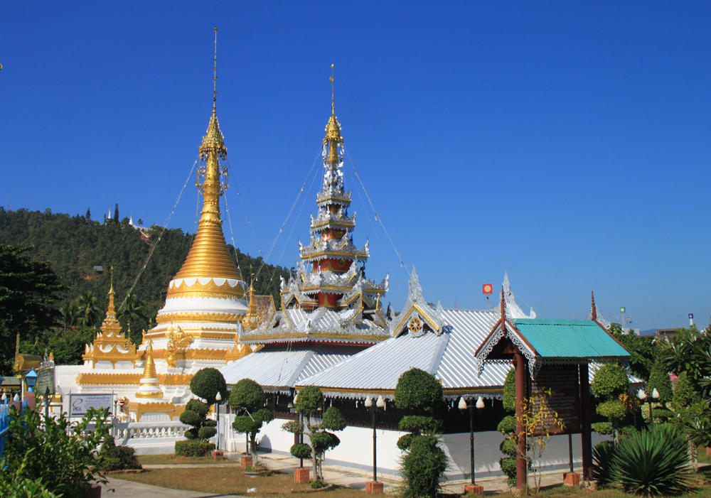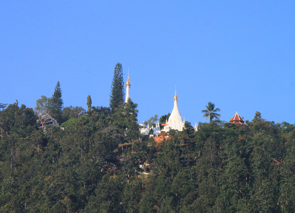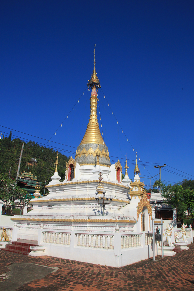 К пагодам на вершине ведет система лестниц. Кто не в силах одолеть подъем, может приехать на машине с другой стороны горки. Тайцы пешком очень не любят ходить, поэтому они в основном ездят, а туристы ходят по лесенкам. Надо сказать, что туристов-европейцев в Мэхонгсоне крайне мало. Ехать далеко. Говорят, вежду Чиангмаем и Мэхонгсоном 1864 поворота горной дороги :-) Тут даже футболки со специальной картинкой продают, типа «Я одолел 1864 поворота». Зато китайских туристов очень много, их количество поворотов не смущает.