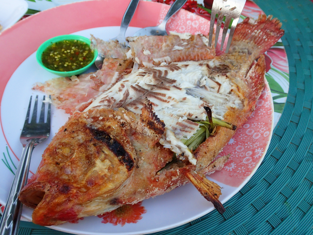 По вечерам на западной стороне озера разворачивается ночной рынок, выставляются к озеру столики. Обычно мы тут ужинали, пробовали всякие вкусности. Как и в Чиангмае, тут пекут на огне вкусную рыбу, обмазанную солью.