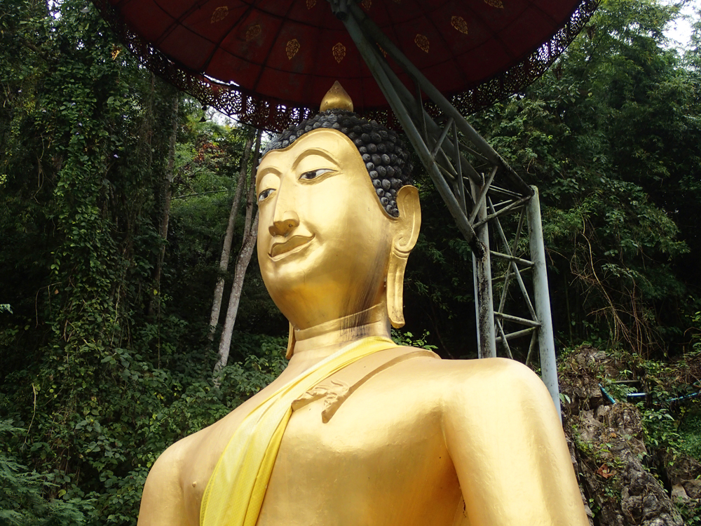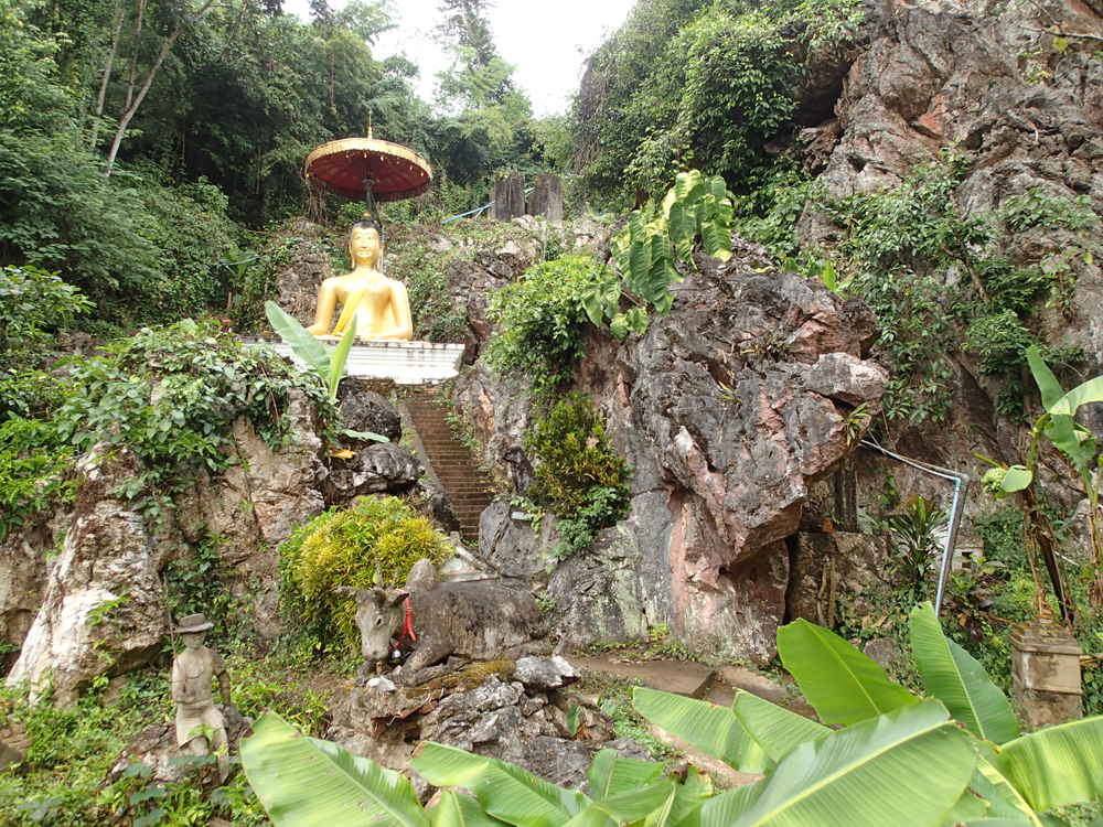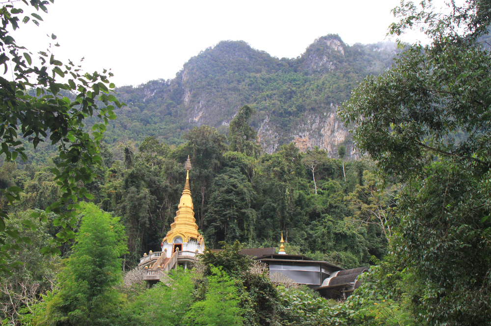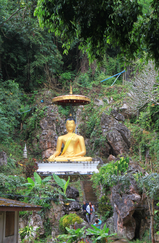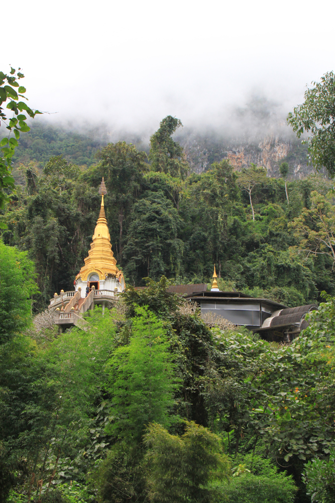 Вернувшись к машине, мы проехали пару километров до храма Tham Pha Plong. В каком-то смысле это тоже пещерный храм (tham — пещера по-тайски), а еще монастырь. К храму ведут 500 ступенек.