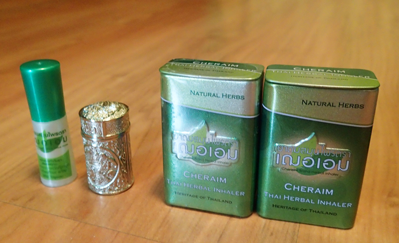Тайские нюхалки. Подсмотрели в чужом блоге про них, они тоже есть в любом 7-eleven. Резкий травяной запах, во-первых, пробивает нос при отеке и заложенности. А во-вторых, нюхалка просто вштыривает, когда устал и хочется спать. Вдохнешь — и заколдобишься! :-))