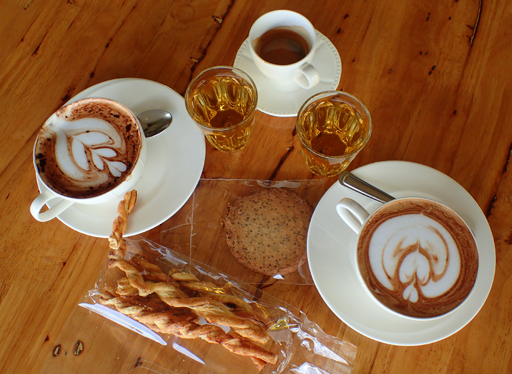 Тут есть эспрессо и капучино, а в маленьких стаканчиках чай из кофейных листьев! Комплимент от заведения.