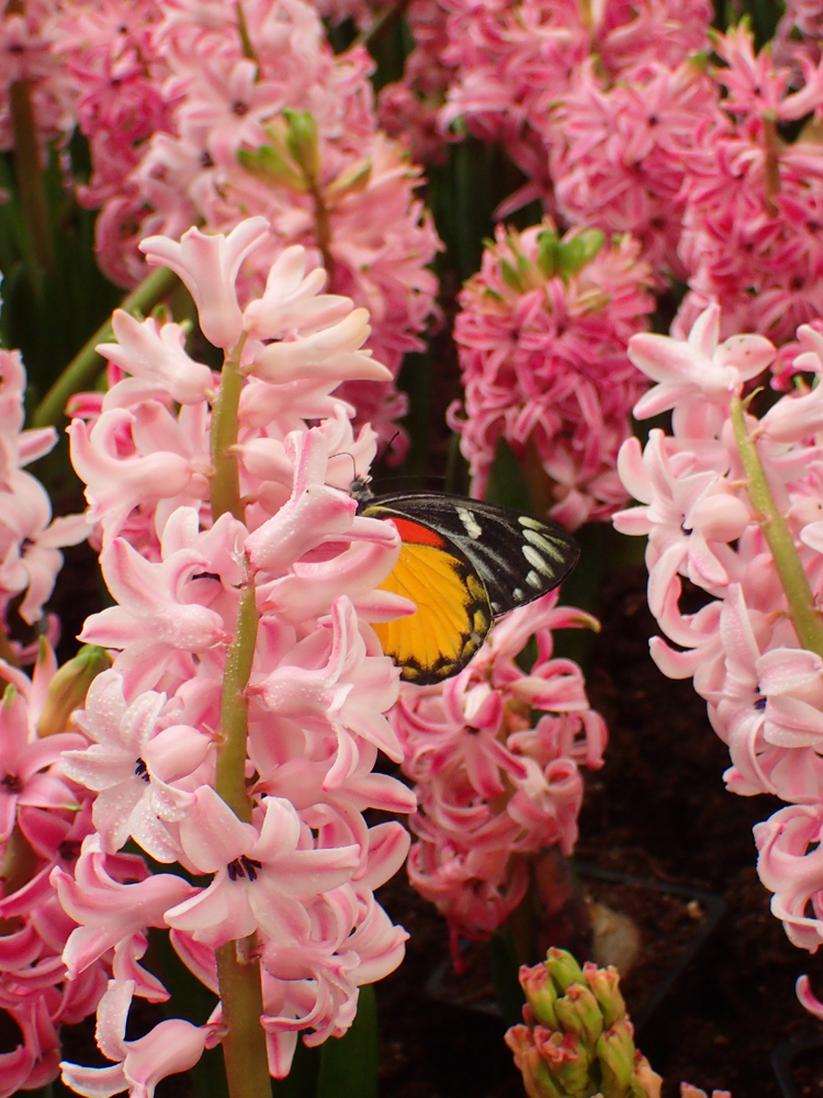 На клумбу с гиацинтами прилетели бабочки.