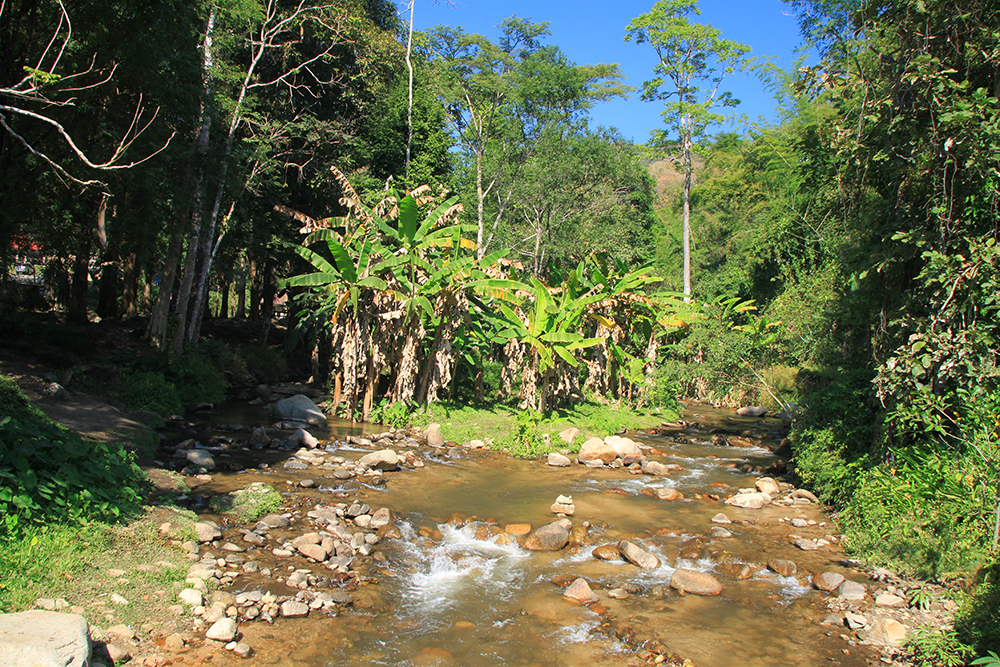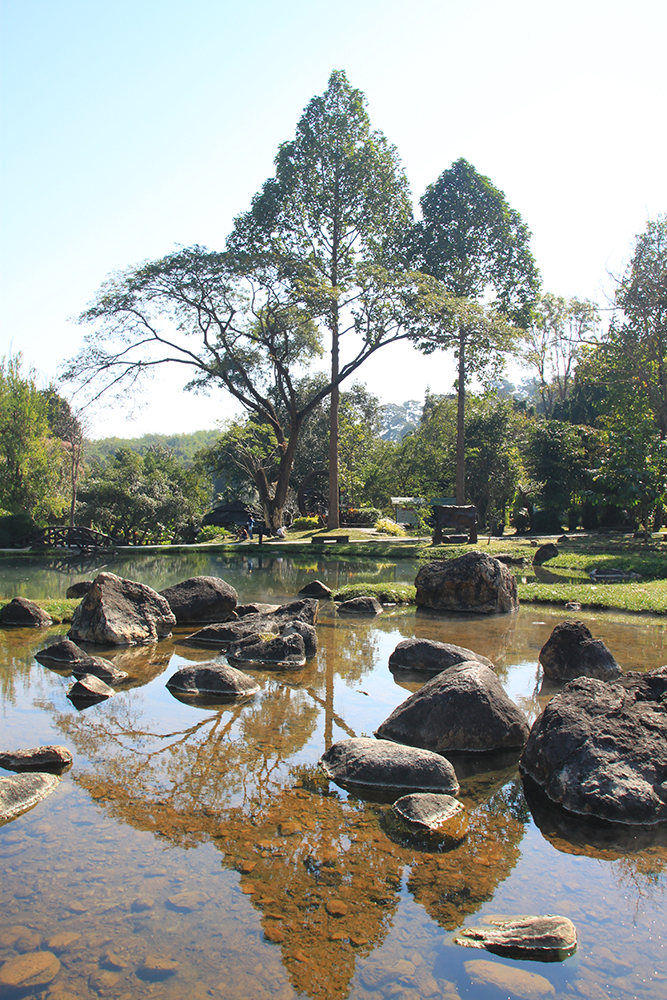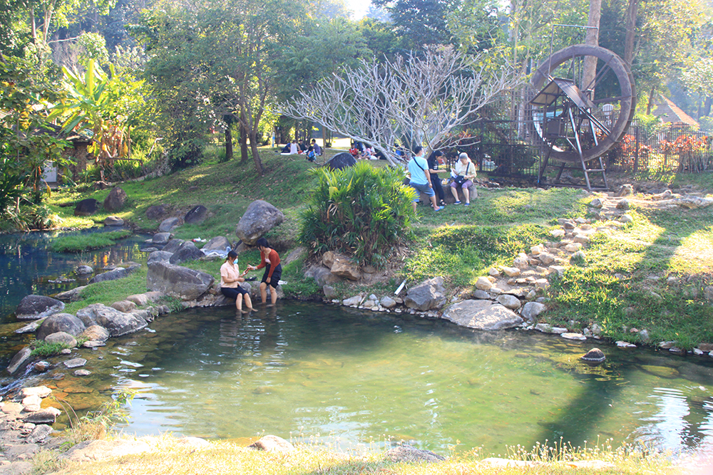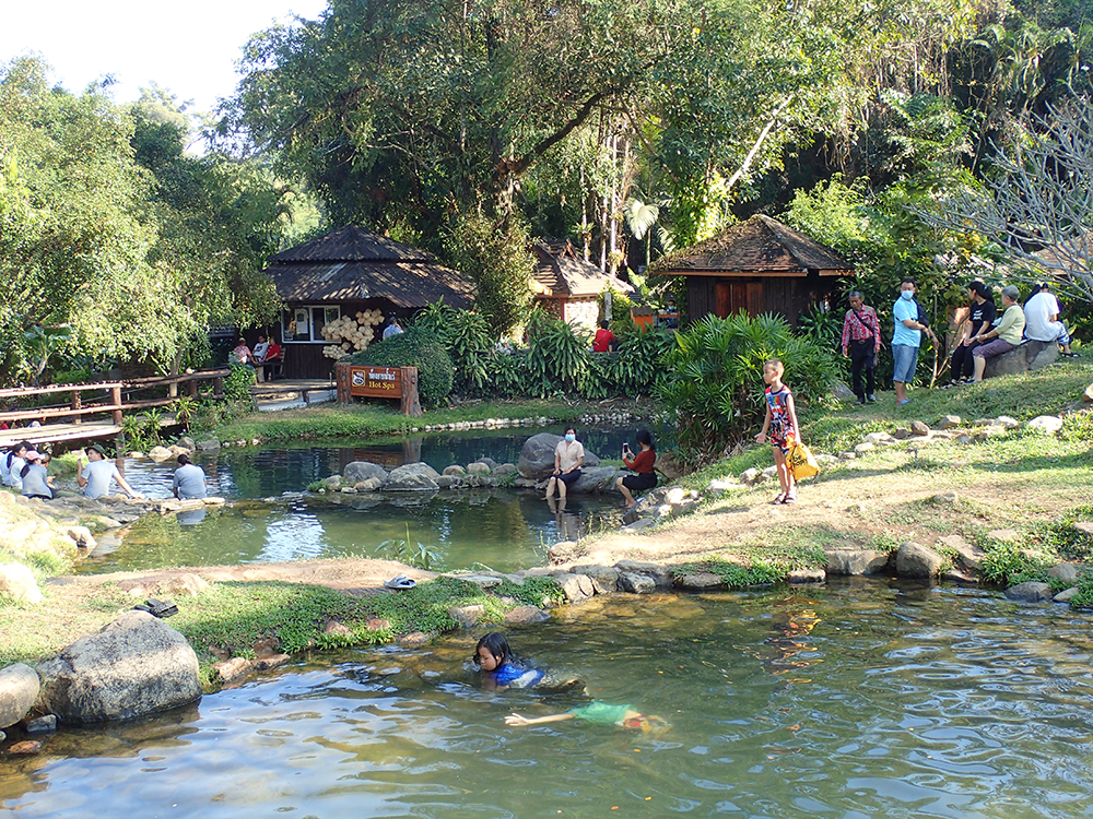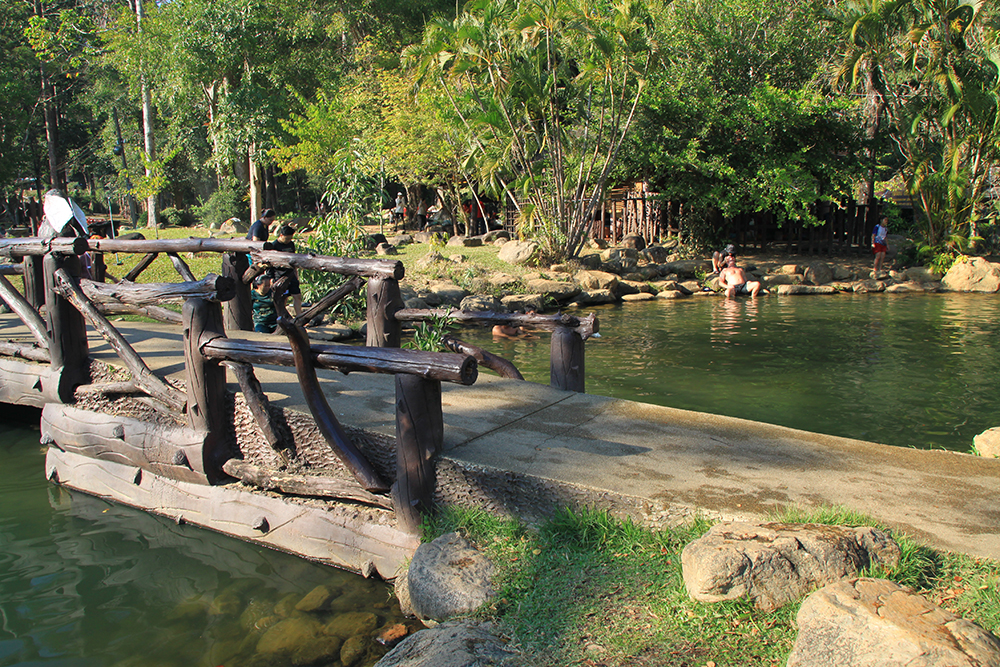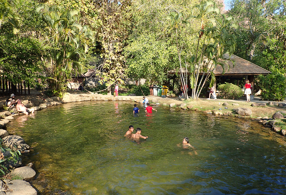 Маленькие теплые бассейны у реки теперь используют только парить ноги. Зато большие теплые пруды, которые пустовали в прошлый раз, нынче для купания. Было воскресенье и довольно много народа, почти все тайцы. Мы выбрали левый большой бассейн, в нем долго можно сидеть, он примерно +36-37 градусов.